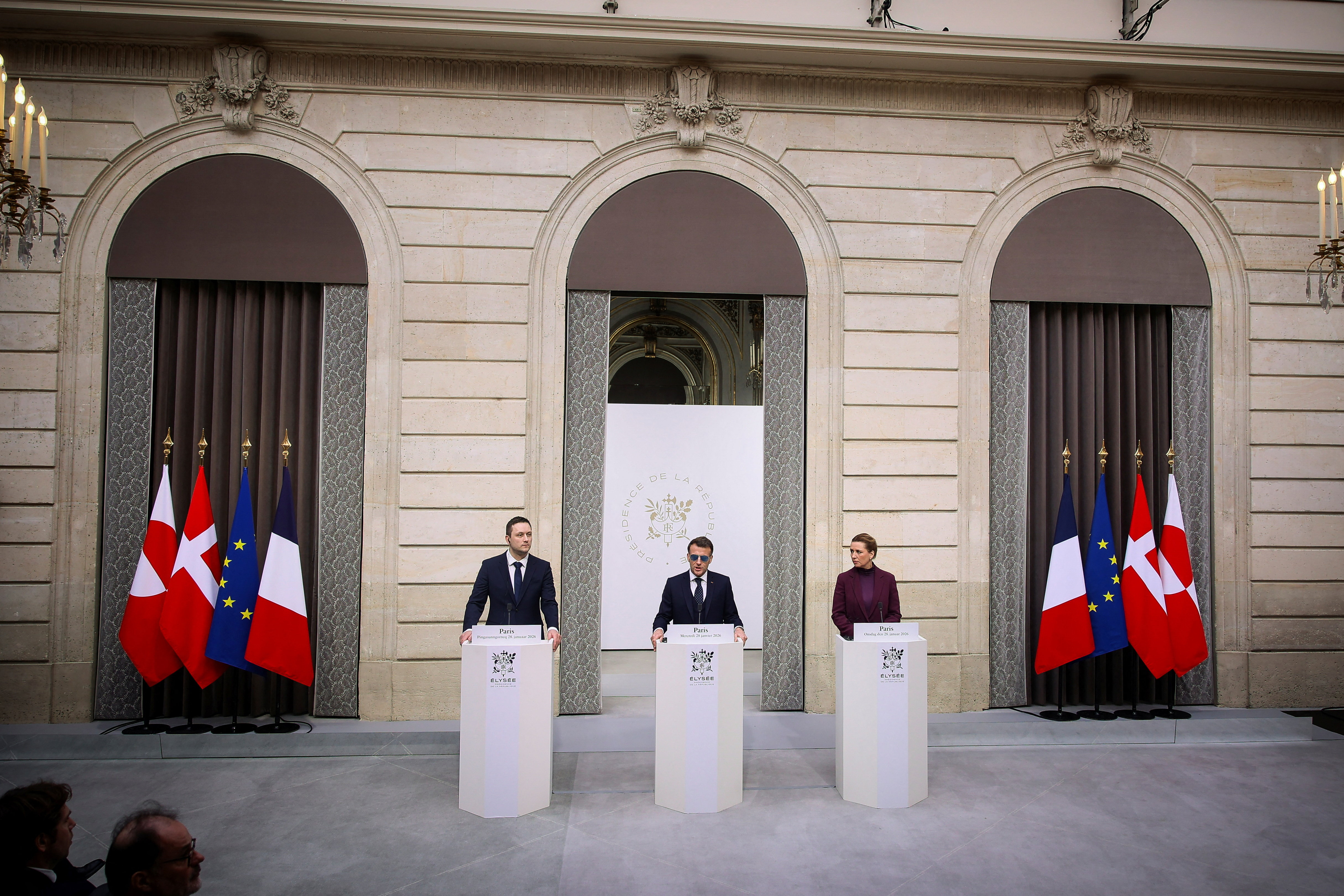 Ο Εμανουέλ Μακρόν εξέφρασε εκ νέου πριν από το γεύμα εργασίας με τους Μέτε Φρέντερικσεν και Γενς Φρέντερικ Νίλσεν στο προεδρικό μέγαρο την αλληλεγγύη της Γαλλίας και την προσήλωσή της «στην κυριαρχία σας και την εδαφική σας ακεραιότητα».