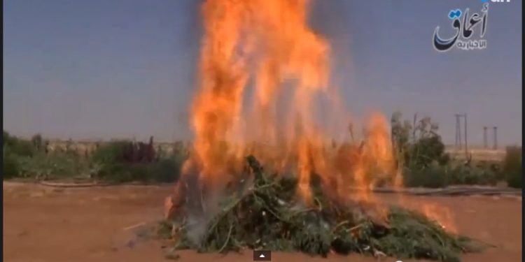 Στο ερασιτεχνικό βίντεο που ήρθε πρόσφατα στη δημοσιότητα, μέλη του Ισλαμικού Κράτους καταστρέφουν μια τεράστια φυτεία με χασισόδεντρα. Η φυτεία των δενδρυλλίων χασίς, βρισκόταν σε αγροτική περιοχή Χαλέπα της Συρίας. Αφού οι ισλαμιστές εκρίζωσαν τα δενδρύλλια, τα συγκέντρωσαν σε στοίβες και με καυστικό υγρό προχώρησαν στη καταστροφή τους. Είναι άγνωστη η συνολική ποσότητα μαριχουάνας που καταστράφηκε.