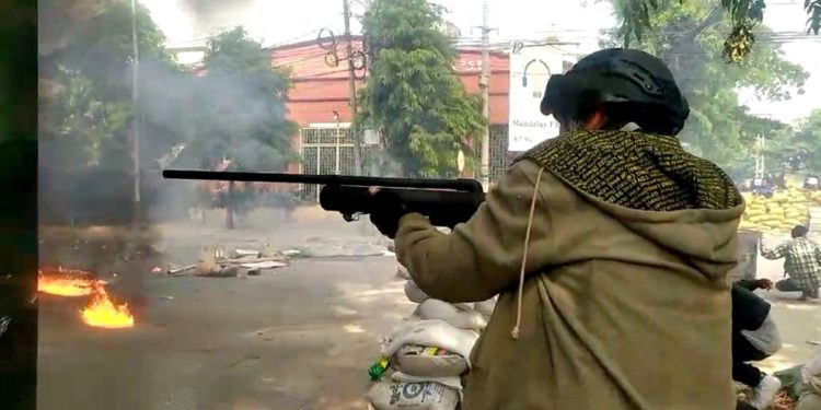 Διαδηλωτές που αξιώνουν την αποκατάσταση της δημοκρατίας είχαν καλέσει σε νέες μαζικές κινητοποιήσεις το Σάββατο, την ημέρα που όπως κάθε χρόνο οι ένοπλες δυνάμεις οργάνωσαν γιγαντιαίων διαστάσεων παρέλαση ενώπιον του επικεφαλής τους – και πλέον του επικεφαλής της στρατιωτικής χούντας – του στρατηγού Μιν Αούνγκ Χλάινγκ.