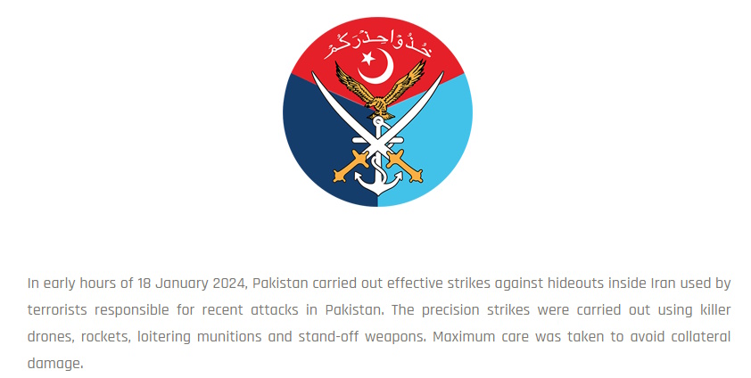 «Σήμερα το πρωί το Πακιστάν διεξήγαγε σειρά πληγμάτων ακριβείας, υψηλού συντονισμού και στοχευμένων συγκεκριμένα, εναντίον κρησφύγετων τρομοκρατών στην επαρχία Σιστάν-Μπαλουτσιστάν» στο νοτιοανατολικό Ιράν, αναφέρει σε ανακοίνωση που εξέδωσε το υπουργείο Εξωτερικών του Πακιστάν.