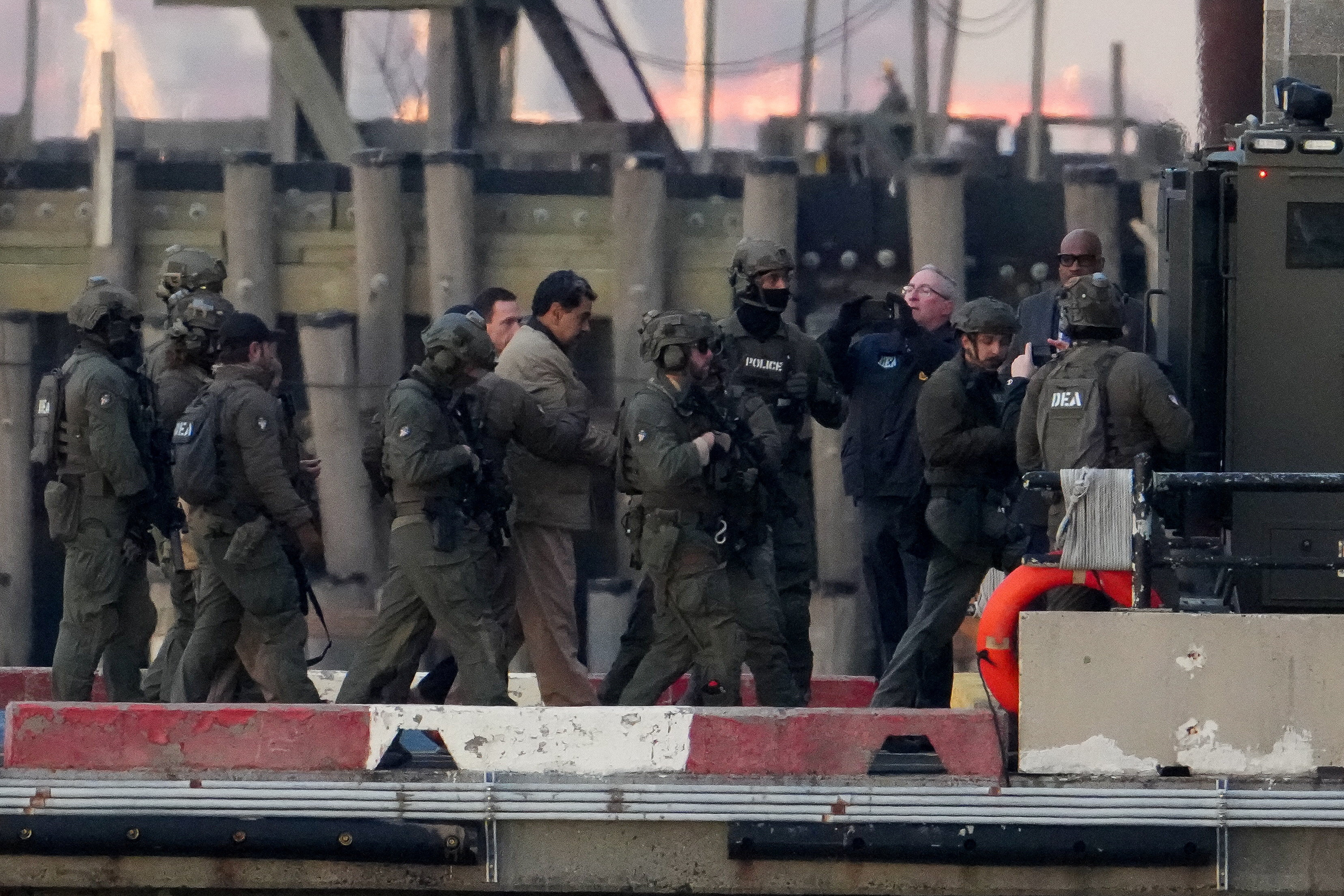 HAPPENING NOW: Nicolás Maduro is escorted off a helicopter and into an armored vehicle by law enforcement, heading to a New York City courtroom for his arraignment. pic.twitter.com/XSeM300wEF