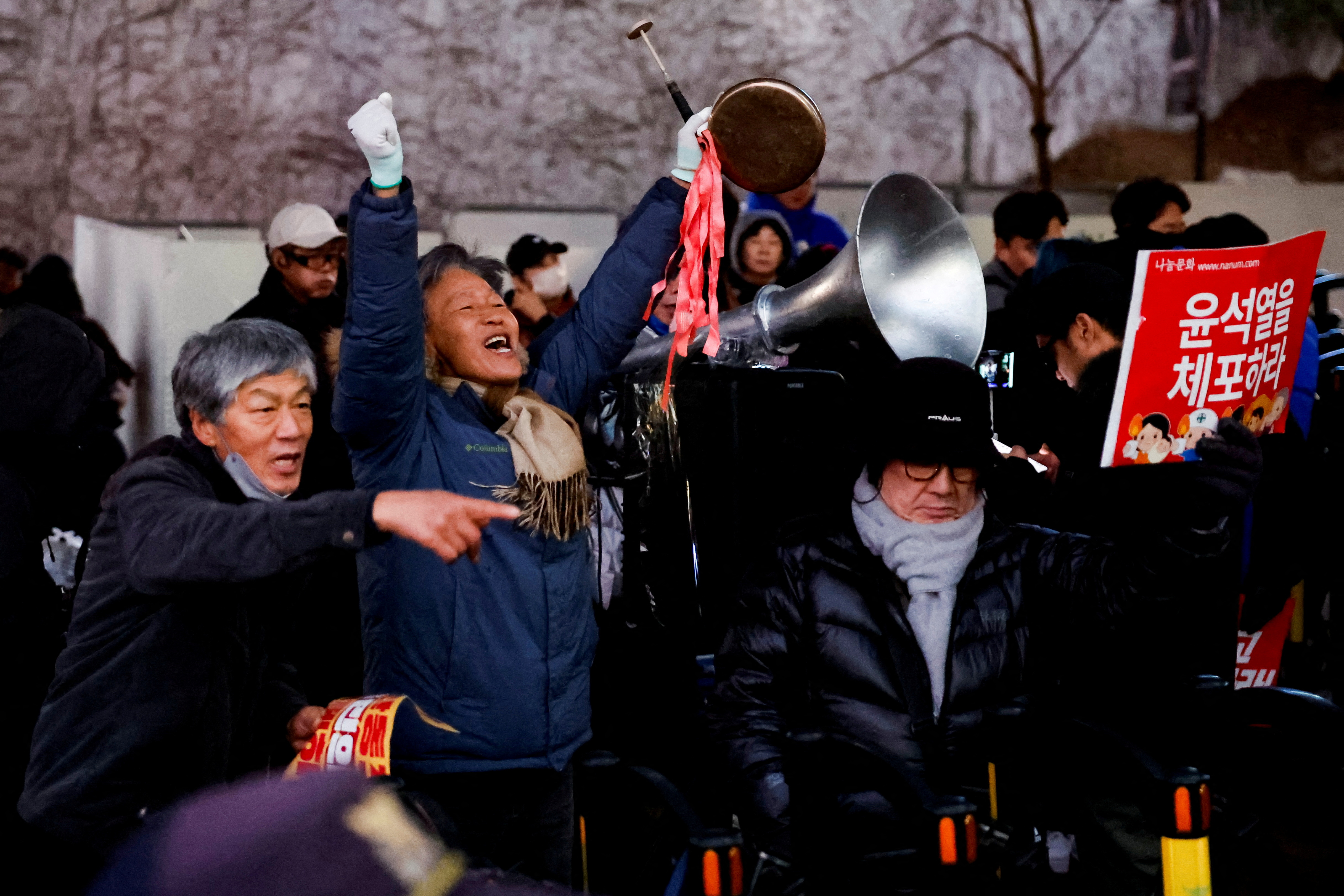 Εκατοντάδες πιστοί υποστηρικτές του Γιουν, μεταξύ αυτών ακροδεξιοί αστέρες του ΥouTube και ευαγγελικοί ηγέτες, συγκεντρώθηκαν μπροστά από την οικία του στη Σεούλ, έχοντας απέναντί τους διαδηλωτές κατά του Γιουν και τις μονάδες αντιμετώπισης ταραχών της αστυνομίας.