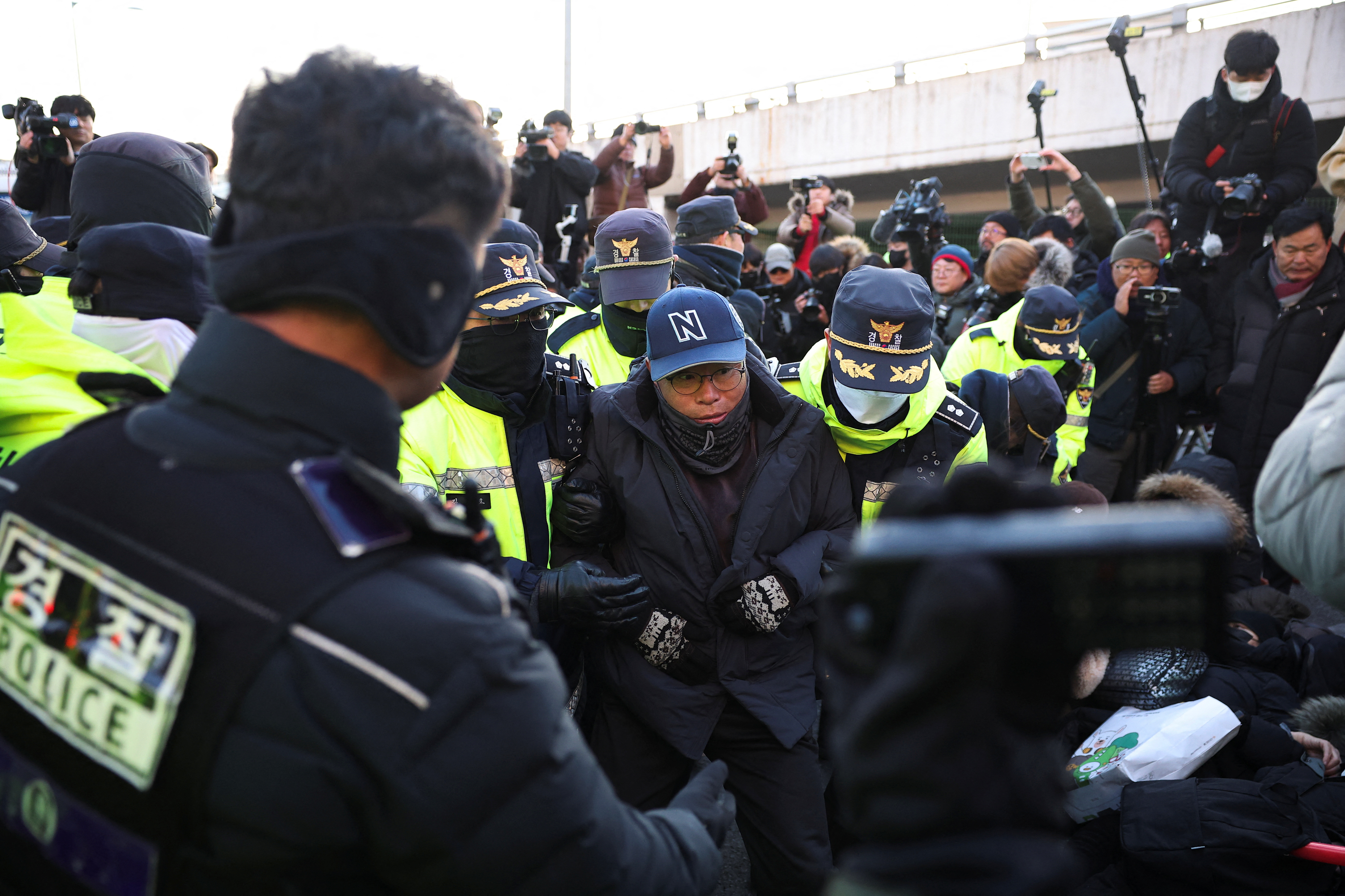 Μία γυναίκα έπεσε μπροστά από ένα λεωφορείο της αστυνομίας, με τα χέρια της τεντωμένα στο παρμπρίζ. Άλλοι υποστηρικτές του καθαιρεθέντος Γιουν ξάπλωσαν στον δρόμο, με τα μάτια κλειστά και τα χέρια τους σταυρωμένα, όταν η αστυνομία επιχείρησε να τους απομακρύνει.