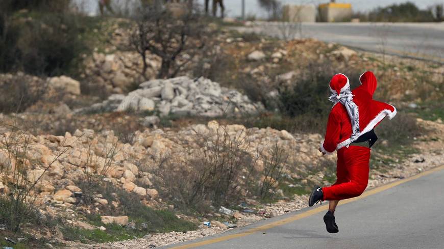 Ακόμη και τον «Αγιο Βασίλη» θύμωσε ο Ντόναλντ Τραμπ με την απόφασή του να αναγνωρίσει την Ιερουσαλήμ ως πρωτεύουσα του Ισραήλ. Έτσι αντι για δώρα, έβγαλε πέτρες από το σάκο του. Αυτή η φωτογραφία του Reuters με τον Παλαιστίνιο διαδηλωτή, ντυμένο Αγιο Βασίλη να πετάει πέτρες κατά των Ισραηλινών στρατιωτών έχει γίνει Viral.