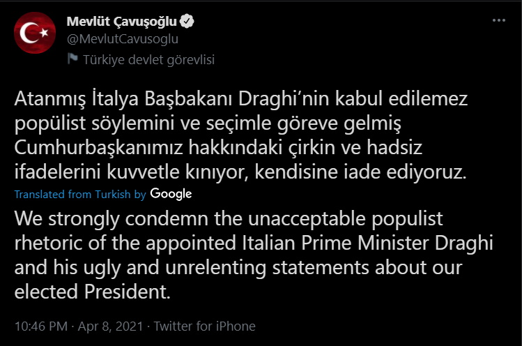 «Καταδικάζουμε έντονα την απαράδεκτη και δημαγωγική ρητορική του διορισμένου Ιταλού πρωθυπουργού Μάριο Ντράγκι και τα προσβλητικά και ανεξέλεγκτα σχόλιά του για τον εκλεγμένο πρόεδρό μας», δήλωσε ο Τσαβούσογλου σε ανάρτηση στο twitter.