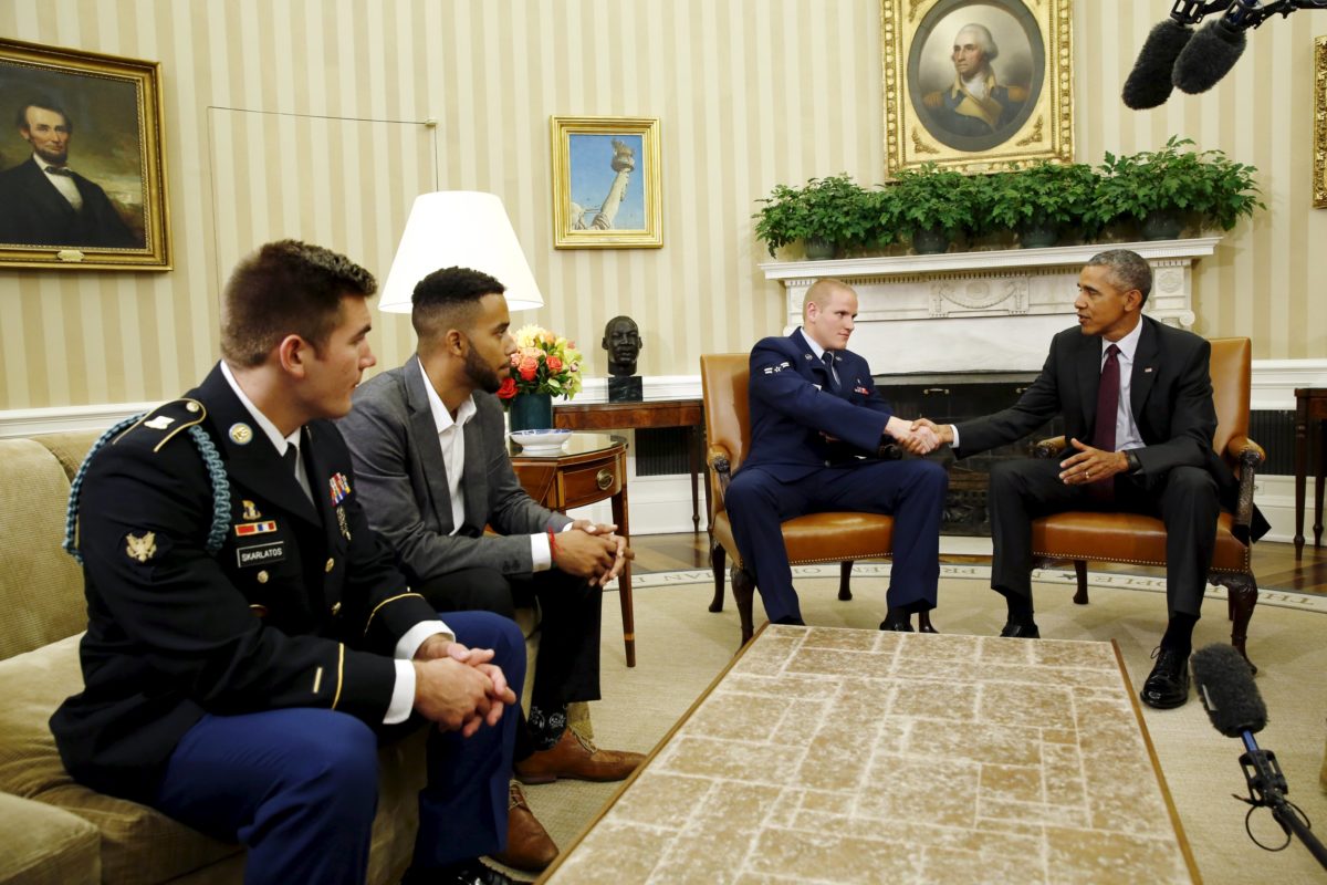 «Αντιπροσωπεύουν το καλύτερο της Αμερικής»: ο πρόεδρος των ΗΠΑ Μπαράκ Ομπάμα εξήρε σήμερα την τόλμη των τριών ηρώων της επίθεσης στην υπερταχεία Thalys στη Γαλλία τους οποίους υποδέχθηκε στο Οβάλ Γραφείο, στο Λευκό Οίκο.