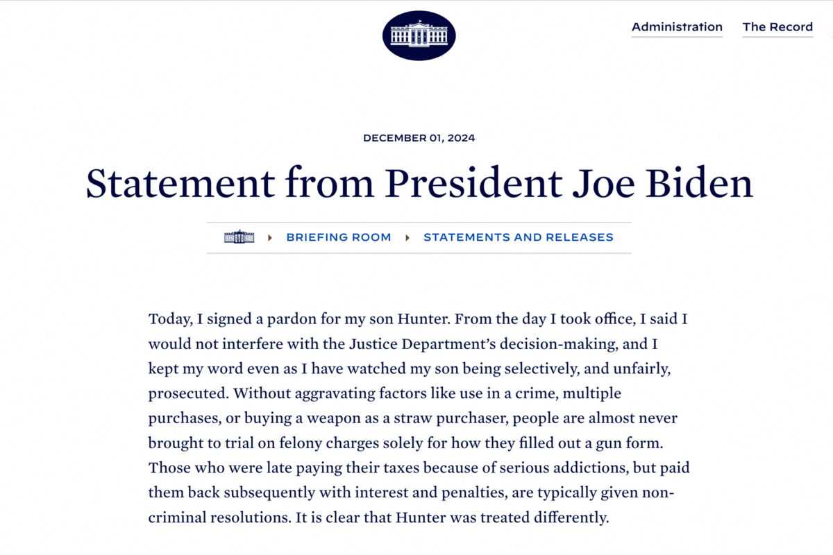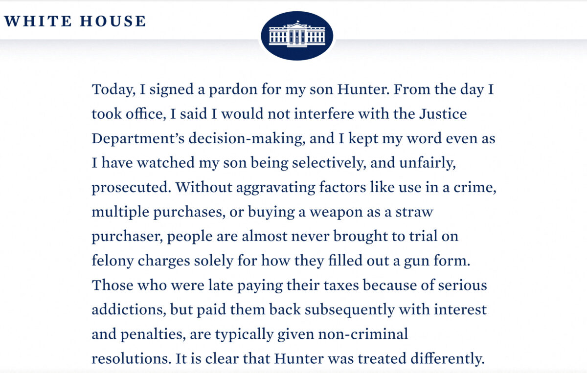 Ο πατέρας του επιχειρηματολόγησε πως «από την μέρα που ανέλαβα την εξουσία, έλεγα πως δεν θα επενέβαινα στη διαδικασία λήψης αποφάσεων του υπουργείου Δικαιοσύνης, και κράτησα τον λόγο μου, παρότι έβλεπα τον γιο μου να υφίσταται επιλεκτικές και άδικες διώξεις», στην ανακοίνωση Τύπου την οποία έδωσε στη δημοσιότητα ο Λευκός Οίκος.