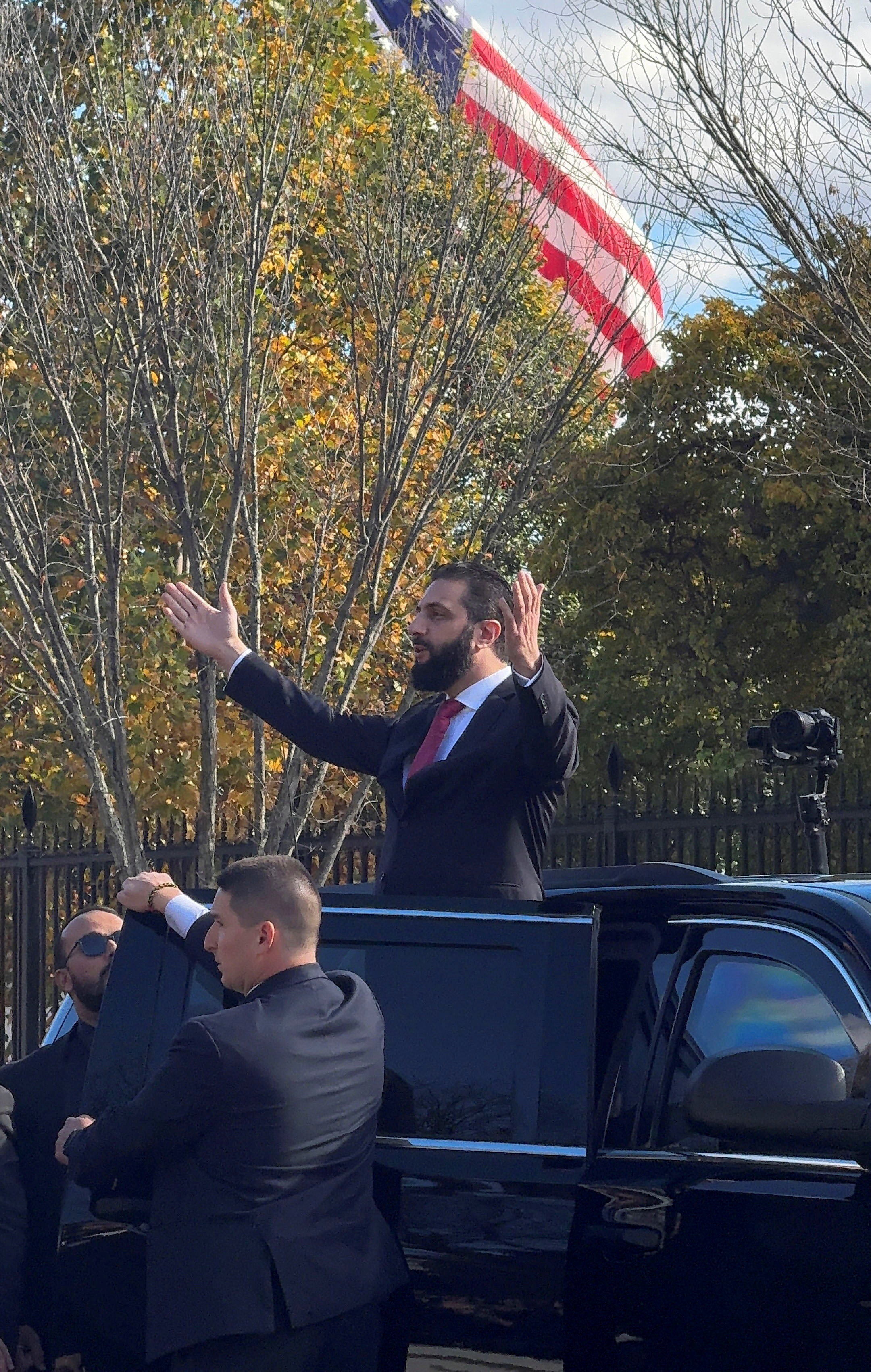Βγαίνοντας από τον Λευκό Οίκο, ο αλ Σάρα χαιρέτισε τους Σύρους υποστηρικτές του που είχαν συγκεντρωθεί.