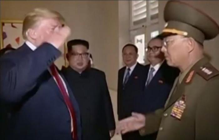 Το βίντεο δόθηκε στην δημοσιότητα την Πέμπτη από τη Βόρεια Κορέα, το οποίο δείχνει στιγμιότυπα από τη συνάντηση των δύο αντιπροσωπειών στις 12 Ιουνίου στη Σιγκαπούρη. Καθώς ο Τραμπ χαιρετά τoν ηγέτη της Βόρειας Κορέας Κιμ Γιονγκ Ουν και τους βοηθους του, ένας βορειοκορεάτης στρατηγός προσφέρει έναν στρατιωτικό χαιρετισμό στον Αμερικανό Πρόεδρο και αυτός τον ανταποδίδει.
