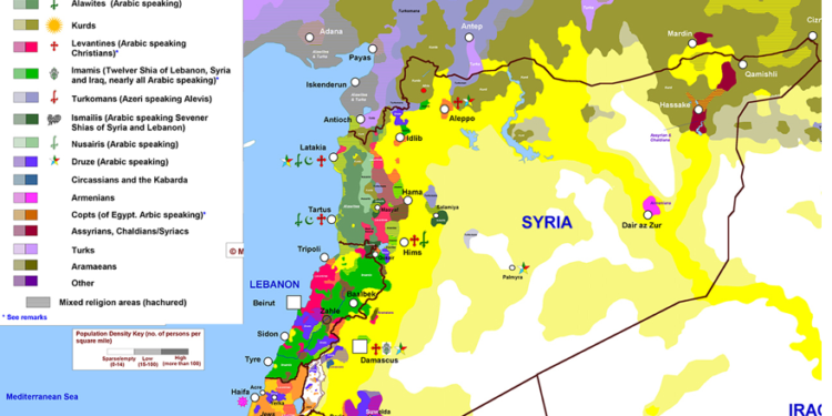 Το ερώτημα γιατί δεν μπορεί να δοθεί ένα τέλος στο δράμα της Συρίας απεικονίζεται με τον καλύτερο τρόπο στον χάρτη του Πανεπιστημίου Columbia . Ένα απίστευτο χαοτικό παζλ από διαφορετικές εθνοτικές,θρησκευτικές και γλωσσικές ομάδες . Και είναι απολύτως βέβαιο ότι αυτό το παζλ δεν μπορεί να μπει σε τάξη με βόμβες και πόλεμο.
