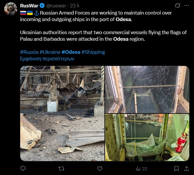 Ρωσική επίθεση με drones προκάλεσε ζημιές σε δύο εμπορικά πλοία υπό ξένες σημαίες στην περιοχή της Οδησσού, στη νότια Ουκρανία, σύμφωνα με τον τοπικό κυβερνήτη Όλεχ Κιπέρ.