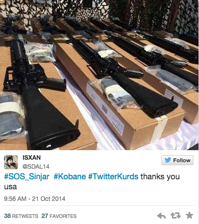 Το παρακάτω tweet δείχνει μάλιστα οτι ακόμη και οι τζιχαντιστές αντιμετωπίζουν την κατάσταση με χιούμορ! Οι φωτογραφίες του αμερικανικού εξοπλισμου ανέβηκαν στο twitter συνοδευόμενες απο ένα μεγάλο ευχαριστώ στις ΗΠΑ!