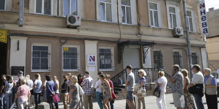 (φωτογραφία: Ρώσοι τουρίστες περιμένουν στην ουρά έξω από το χρειοκοπημένο τουριστικό πρακτορείο NEVA -πηγή: Reuters)