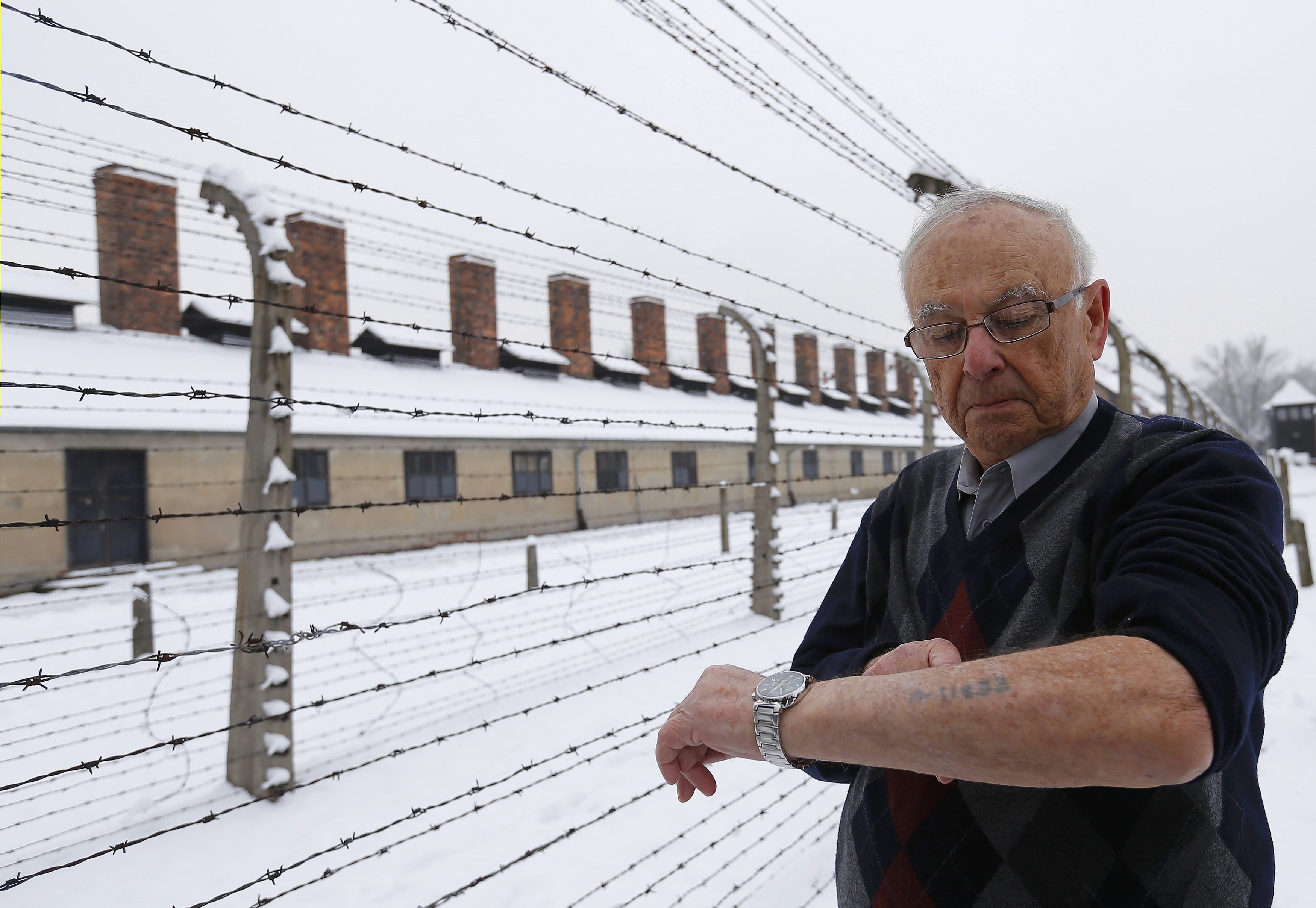 (Επιζών δείχνει το τατουάζ με τον αριθμό κρατουμένου του Άουσβιτς)