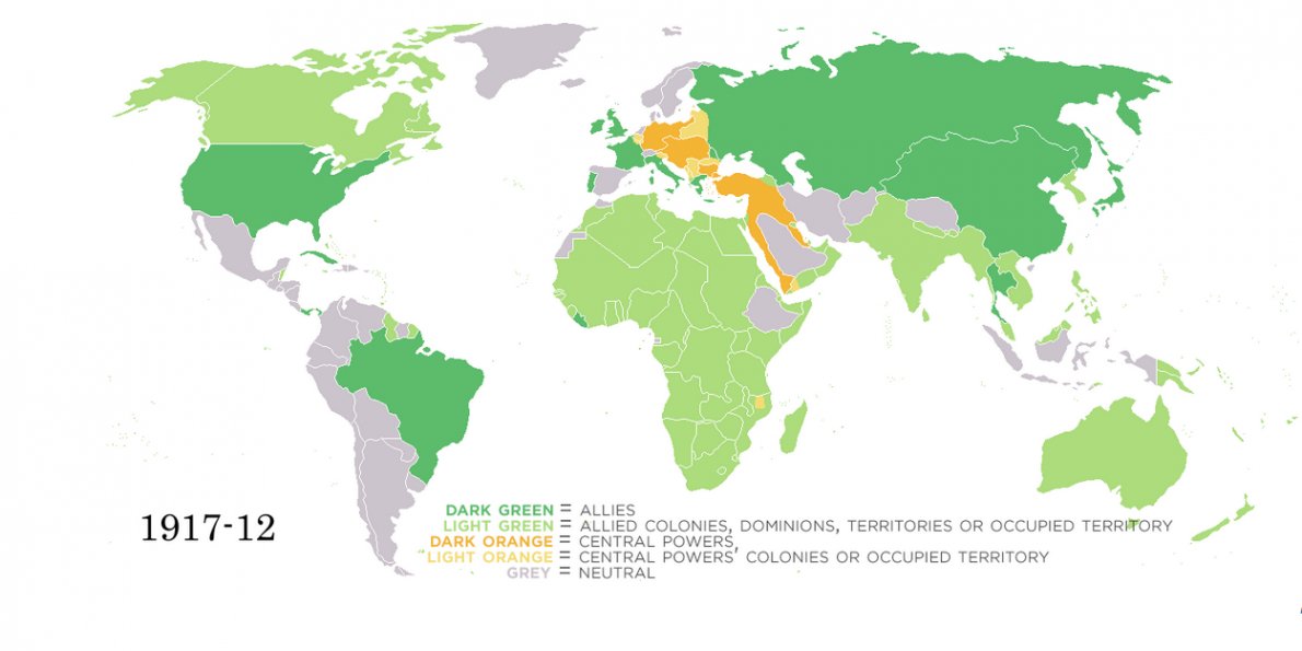 Ο χρήστης του Reddit (διαδικτυακή υπηρεσία με ψυχαγωγική και ειδησεογραφικό χαρακτήρα) Srirachachacha μοιράστηκε αυτό το χάρτη που απεικονίζει την «εξάπλωση» του πολέμου σε όλο τον κόσμο. Το GIF δίνει μια συναρπαστική ματιά στο έδαφος και στις κτήσεις που κατείχαν οι Ενωμένες Δυνάμεις (Αντάντ) από τη μια και οι Κεντρικές Δυνάμεις από την άλλη, όπως επίσης τις αποικίες τους.