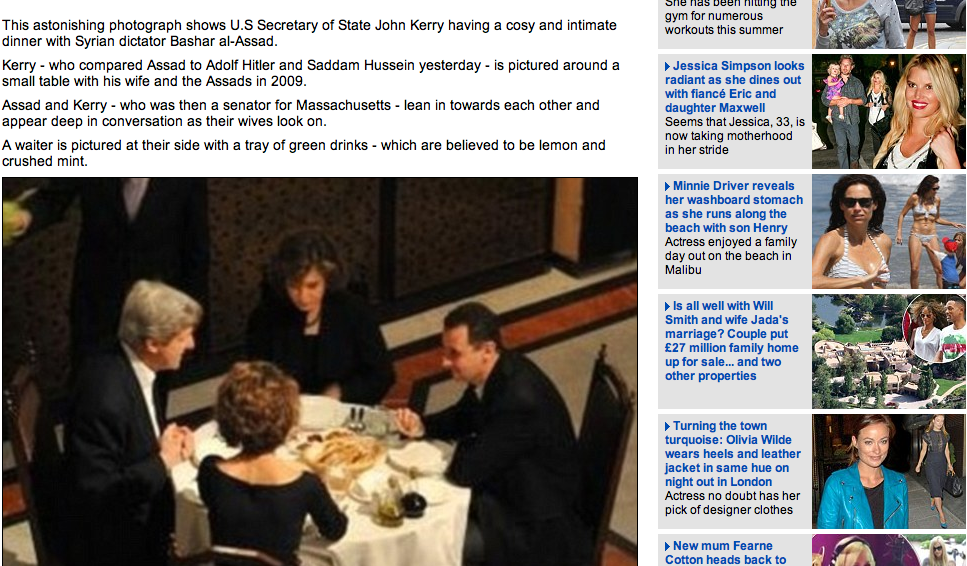 Χθες ο Τζον Κέρι ο αμερικανός ΥΠΕΞ χαρακτήριζε τον Άσαντ εγκληματία και δολοφόνο. Το 2009 δειπνούσε μαζί του και η φωτογραφία του AFP που δημοισεύει η Daily Mail μοιάζει απίστευτη!