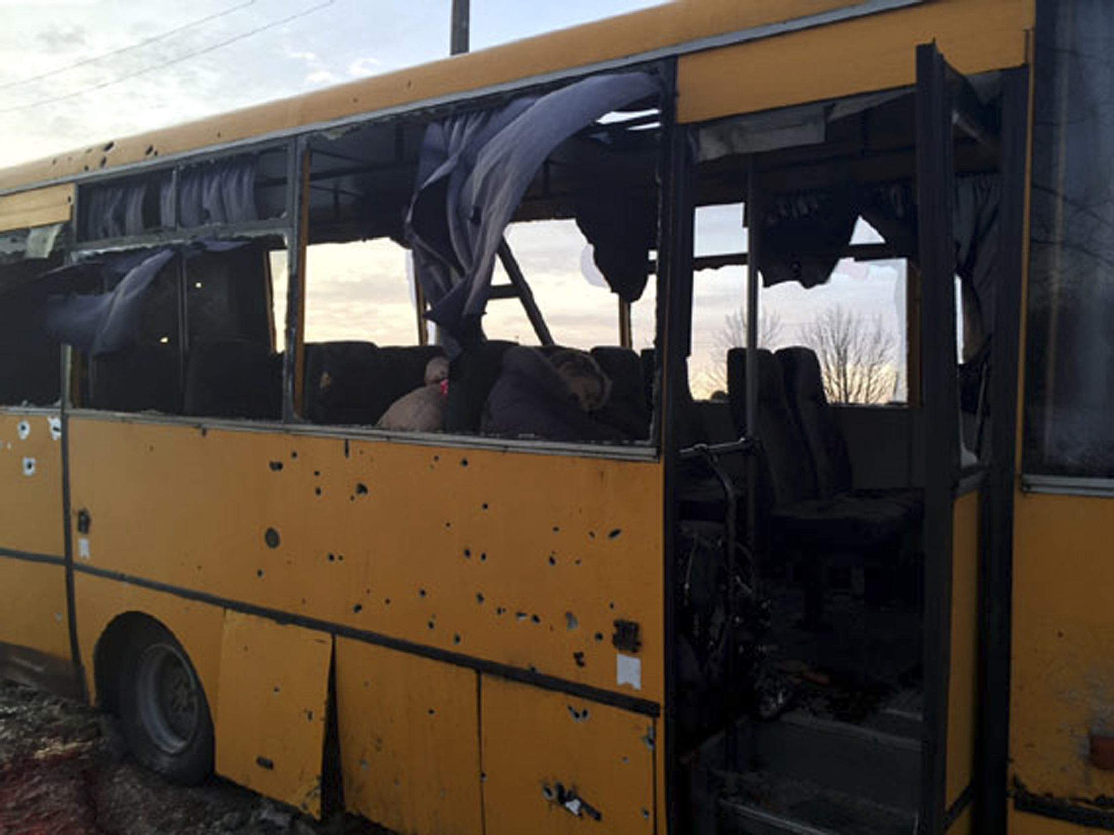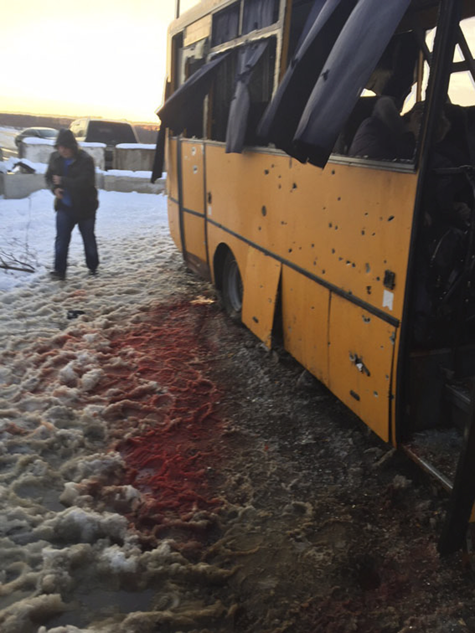 Δώδεκα άμαχοι σκοτώθηκαν και δεκατρείς τραυματίστηκαν, στη διάρκεια βομβαρδισμού εναντίον ενός σημείου ελέγχου του ουκρανικού στρατού, από τον οποίο επλήγη ένα λεωφορείο στην αυτονομιστική φιλορωσική ανατολική Ουκρανία, σε μια επίθεση που ήταν η φονικότερη από την έναρξη της εκεχειρίας της 9ης Δεκεμβρίου.