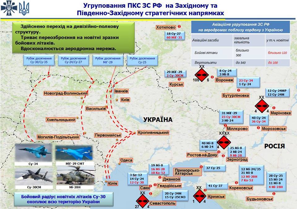 Το Γενικό Επιτελείο των Ενόπλων Δυνάμεων της Ουκρανίας έδωσε στη δημοσιότητα χάρτη, στον οποίο υπάρχουν καταγεγραμμένες οι θέσεις και οι αριθμοί των μαχητικών αεροσκαφών και επιθετικών ελικοπτέρων της Ρωσίας κοντά στα σύνορα με την Ουκρανία, δηλαδή στα αεροδρόμια της νότιας και δυτικής Ρωσίας.
