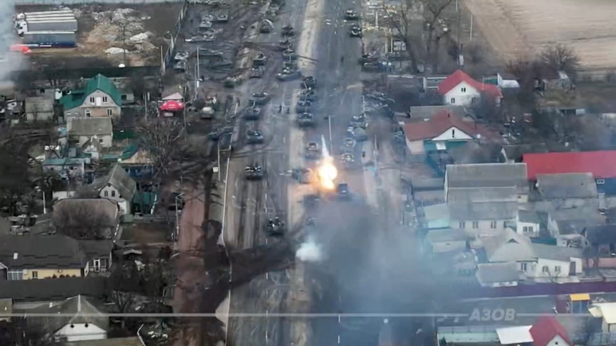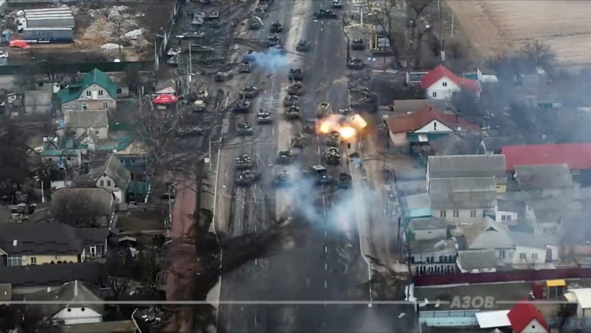 Οι ουκρανικές αρχές ένα drone αντιλήφθηκε την προέλαση του ρωσικού κομβόι. αμέσως έδωσε τις συντεταγμένες, το πυροβολικό ανέλαβε δράση βομβαρδίζοντας τα ρωσικά τανκ, καταστρέφοντας κάποια από αυτά.