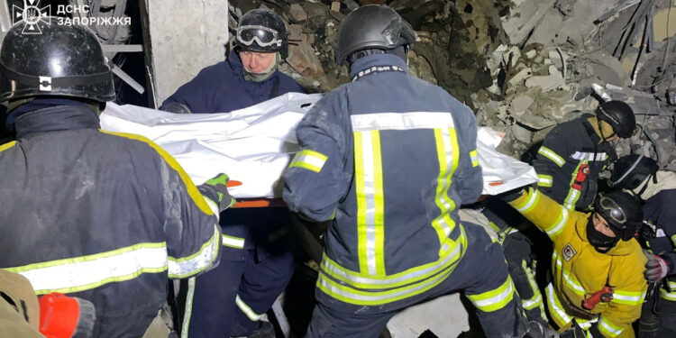 Φωτογραφίες που αναρτήθηκαν στο Telegram δείχνουν διασώστες και μηχανήματα να μετακινούν σωρούς από συντρίμμια από το κτίριο που κατέρρευσε στη διάρκεια της νύχτας. Η Ρωσία εξαπολύει τακτικά αεροπορικές επιθέσεις στη Ζαπορίζια και στην γύρω περιοχή. Την περασμένη Παρασκευή επίθεση που σημειώθηκε στην πόλη στοίχισε τη ζωή σε δέκα ανθρώπους και τραυμάτισε περισσότερους από 20.