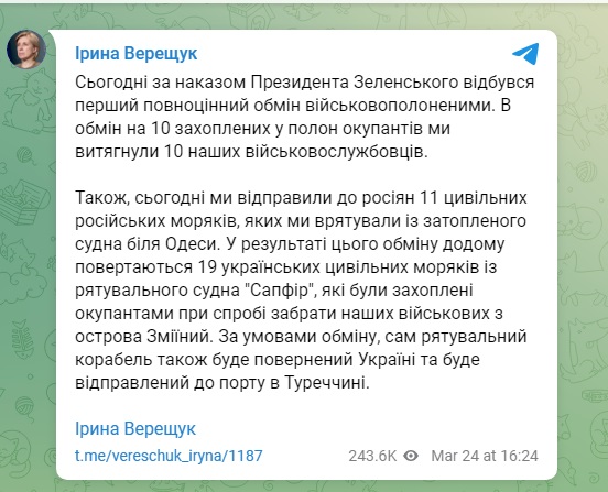 Η Vereschuk έκανε γνωστή την ανταλλαγή αιχμαλώτων μέσω Telegram: