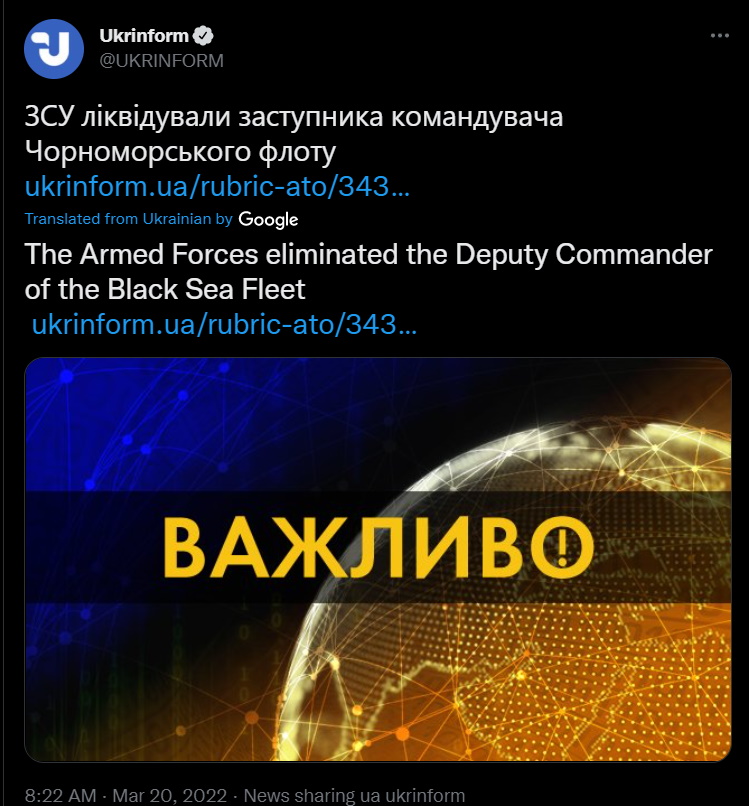 Η Ουκρανία υποστηρίζει ότι οι Ένοπλες Δυνάμεις τους σκότωσαν άλλον έναν ανώτατο αξιωματικού της Ρωσίας, αυτή τη φορά του Πολεμικού Ναυτικού.