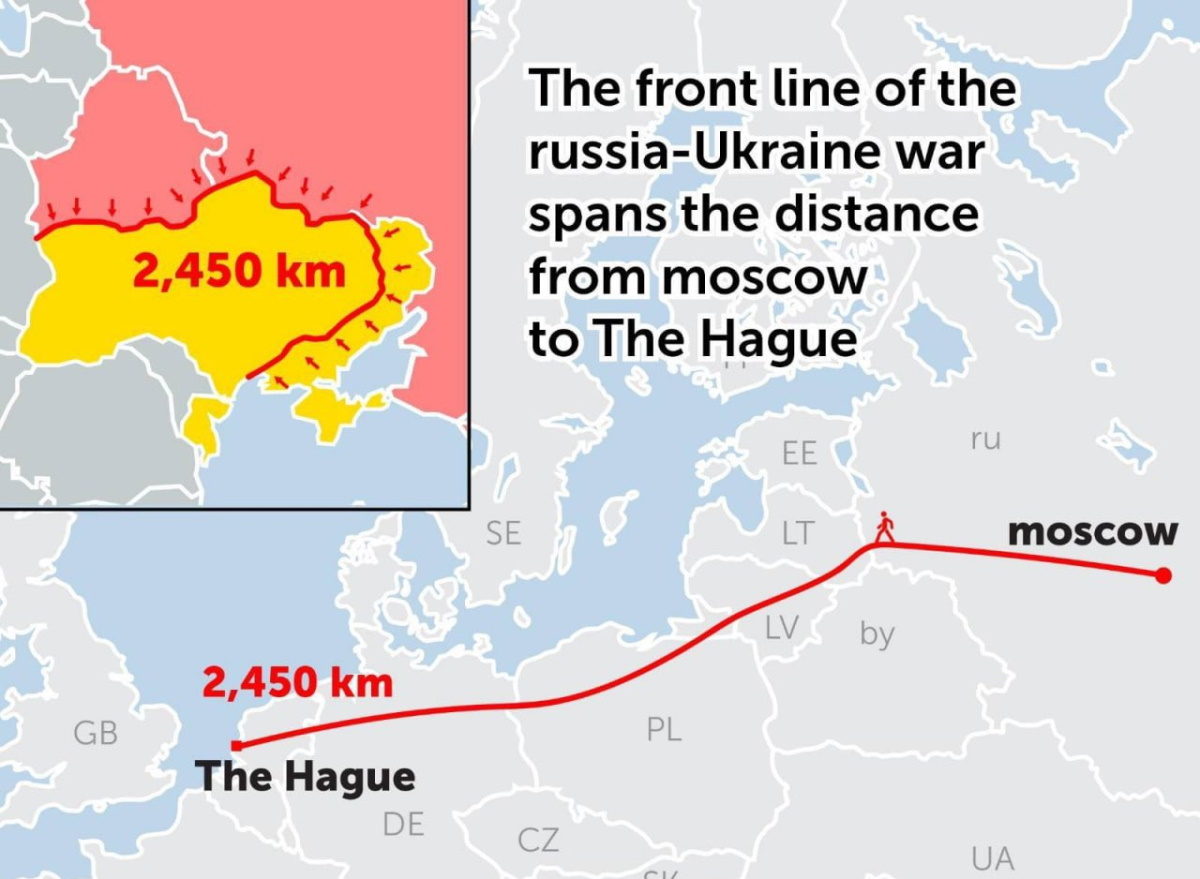 Έτσι παρουσίασε τέσσερις χάρτες που αποτυπώνουν τα 2.450 χιλιόμετρα που αποτελούν το μέτωπο του πολέμου που de facto κήρυξε η Ρωσία στην Ουκρανία με την εισβολή της 24ης Φεβρουαρίου, σε αναλογίες γνωστών – και άρα πιο κατανοητών – τοποθεσιών.