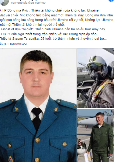 Νεκρός φέρεται να έπεσε ο 29χρονος επισμηναγός Στέπαν Ταραμπάλκα, τον οποίο αποκαλούσαν και «Φάντασμα του Κιέβου», καθώς στον πόλεμο στην Ουκρανία κατέρριψε πάνω από 40 ρωσικά αεροσκάφη, υποστηρίζουν οι Times.