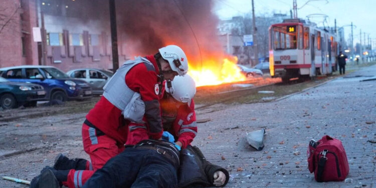 Σύμφωνα με τις φωτογραφίες, από τη ρωσική επίθεση επλήγη ένα μίνι βαν – ταξί, ένα τραμ και ένα πολυώροφο κτίριο όπου ξέσπασε πυρκαγιά.