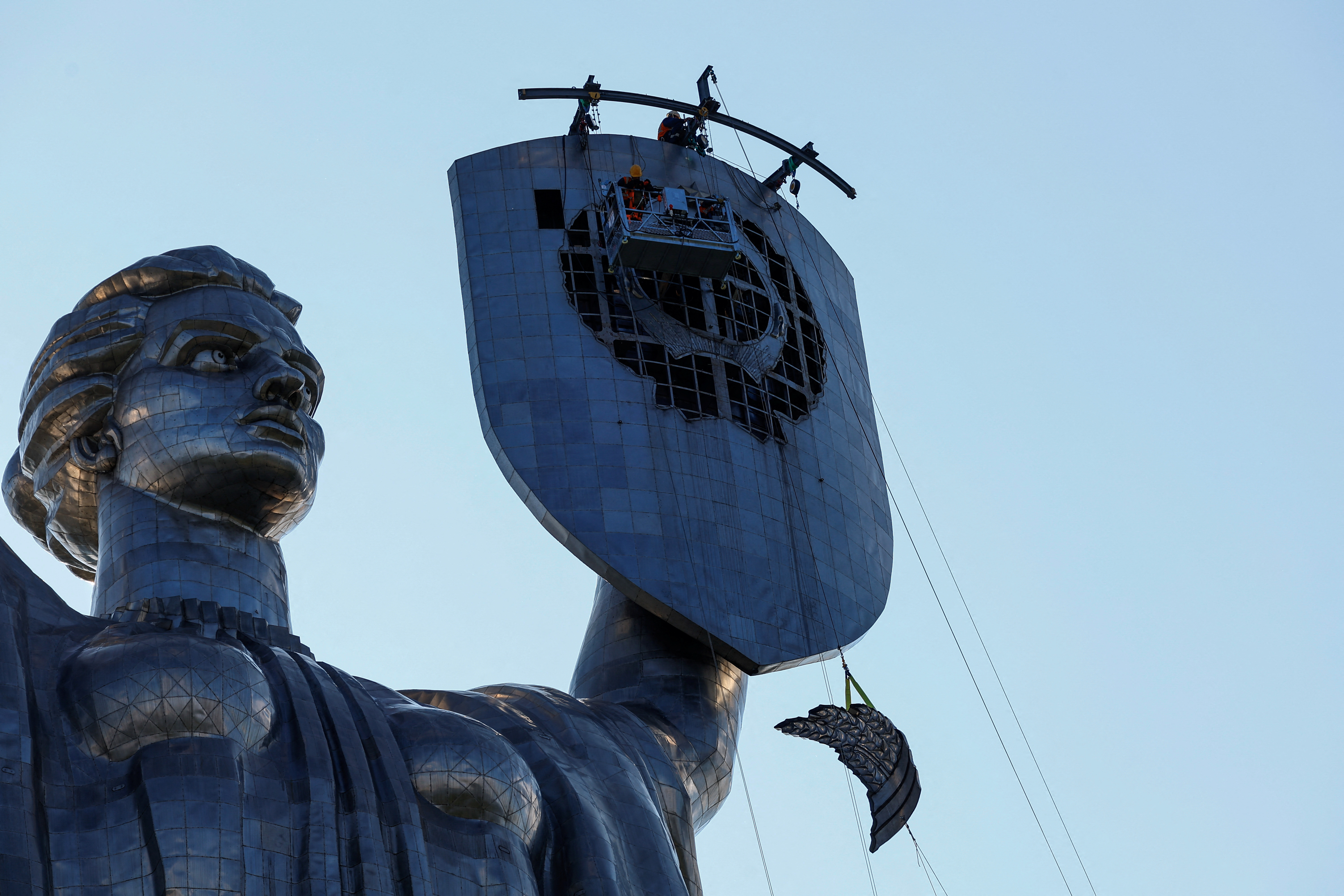 In #Kyiv, the Soviet coat of arms was removed from the "Motherland" monument. pic.twitter.com/NyE8CyknWA