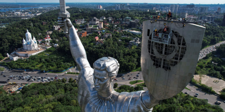 Οι αρχές του Κιέβου αφαίρεσαν το σφυροδρέπανο, το έμβλημα της πάλαι ποτέ Σοβιετικής Ένωσης, από το μνημείο της Μητέρας Πατρίδας στην πρωτεύουσα, όπως μετέδωσε χθες Τρίτη η ουκρανική ραδιοτηλεόραση.
