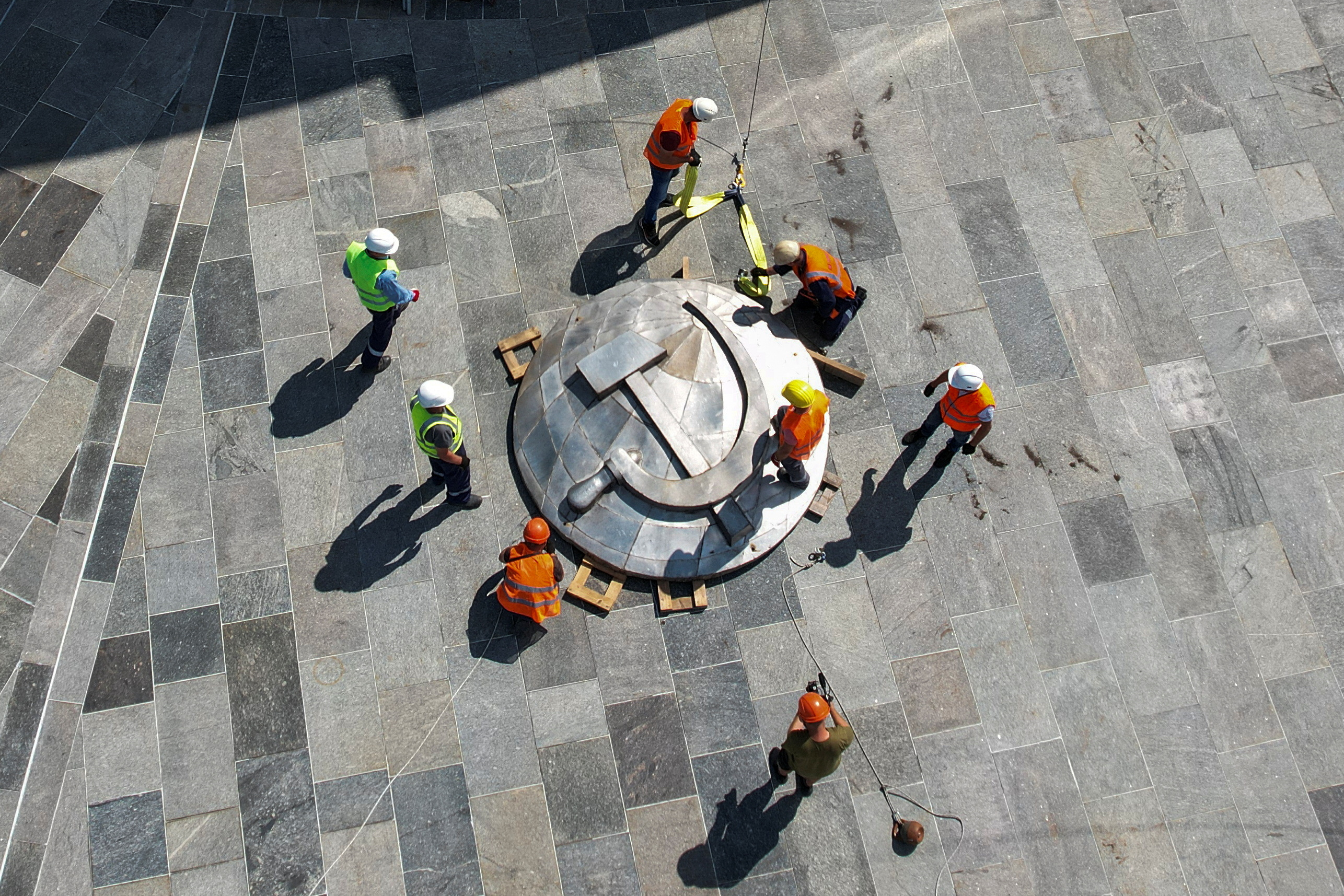 Historical moment: the dismantling of the emblem of the Soviet Empire from the "Motherland" monument in Kyiv pic.twitter.com/matWN9tzqr
