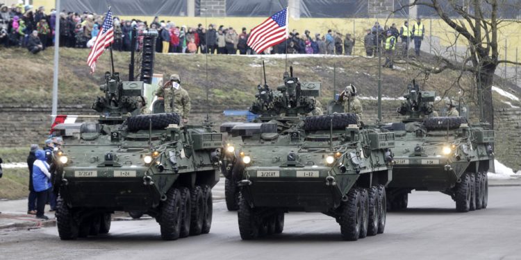 Οχήματα του στρατού των ΗΠΑ και Βρετανοί στρατιώτες παρέλασαν στους δρόμους εσθονικής πόλης, μόλις 300 μέτρα από τα σύνορα της Εσθονίας με τη Ρωσία χθες, σε μια επίδειξη ενότητας της Δυσης ενάντια στην απειλή της Μόσχας.