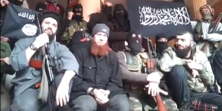 (Στη φωτογραφία Ρώσοι ή Ρωσόφωνοι Ισλαμιστές απο την περιοχή του Καυκάσου σ’ενα βίντεο που ανήρτησαν στο Facebook τον Ιούνιο 2015)