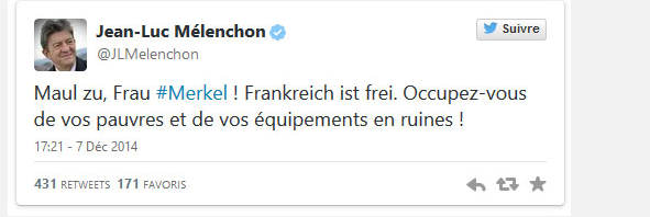 «Βουλώστε το κυρία Μέρκελ! Η Γαλλία είναι ελεύθερη. Ασχοληθείτε με τους δικούς σας φτωχούς και τα δικά σας ερείπια», τόνισε χαρακτηριστικά ο Ζαν Λυκ Μελανσον, στο μήνυμά του προς την Γερμανίδα καγκελάριο στο Twitter.