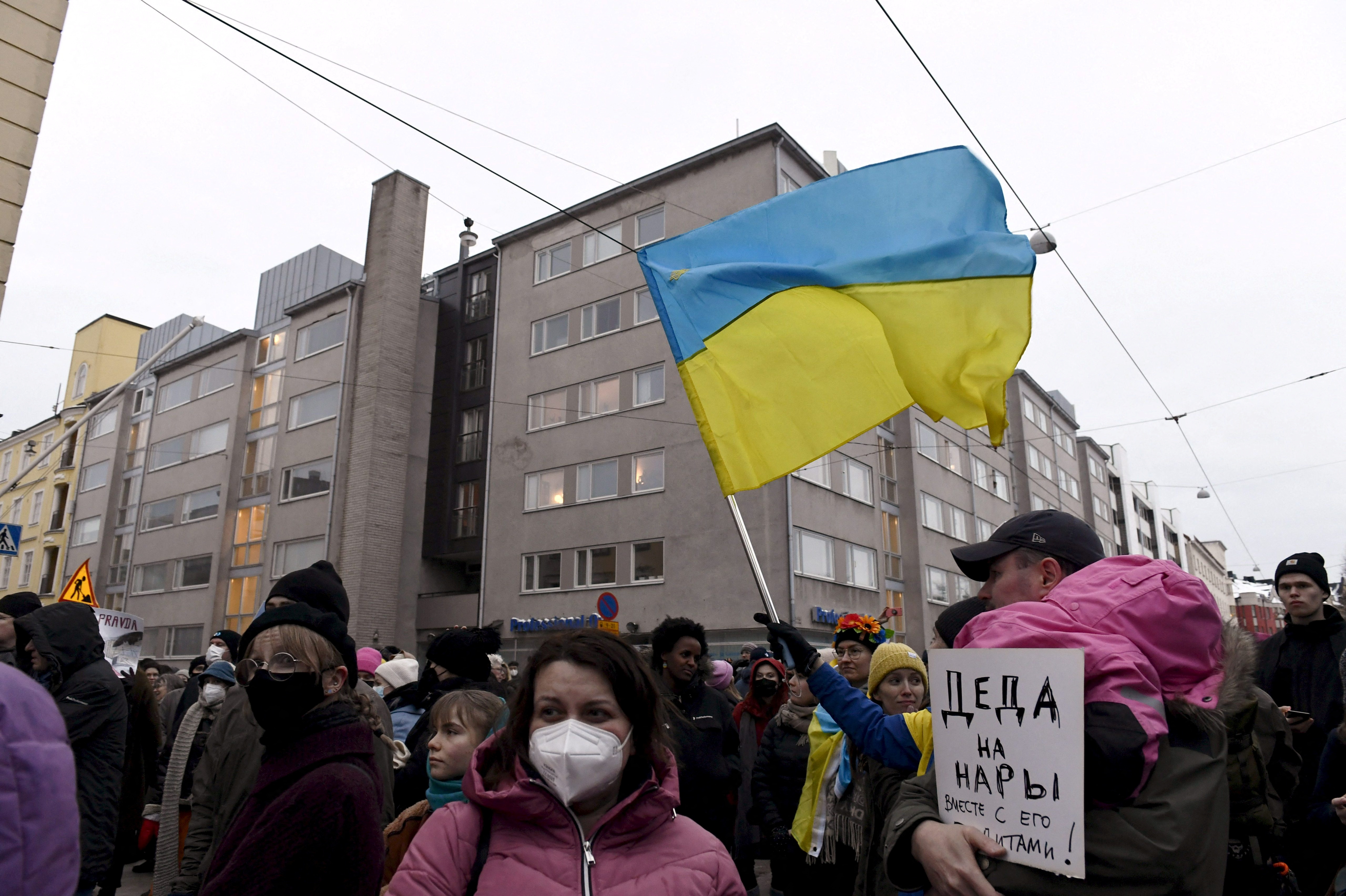 «Σταματήστε αυτήν την τρέλα, σώστε τη ζωή, όχι άλλα ψέματα»: μπροστά από τη ρωσική πρεσβεία στο Βερολίνο, ένας διαδηλωτής κρατούσε ένα πλακάτ με το παραπάνω σύνθημα. Άλλοι κρατούσαν ή είχαν σκεπαστεί με την ουκρανική σημαία. Μεταξύ των διαδηλωτών, Ρώσοι επικρίνουν τη στρατιωτική επιχείρηση που ξεκίνησε η Μόσχα.