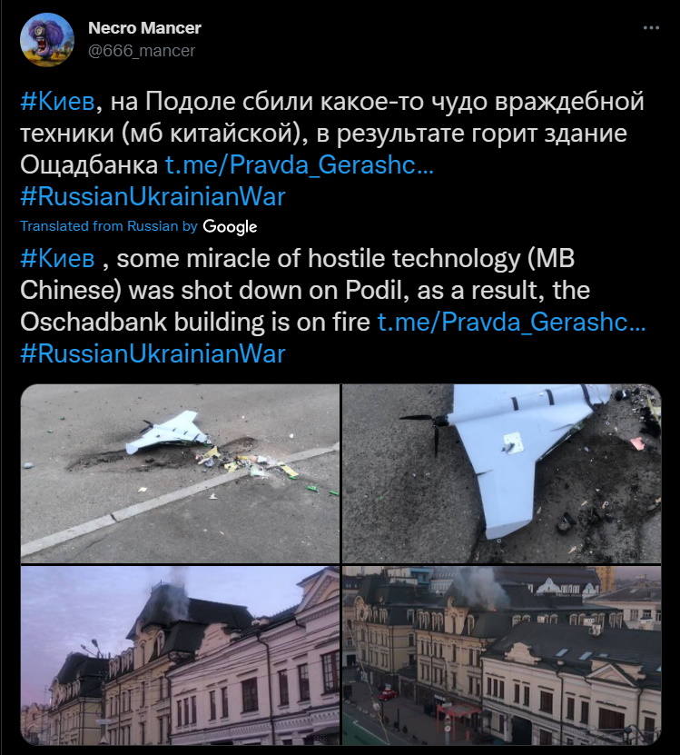 Όπως παρατήρησε ο χρήστης του Twitter Rob Lee, πρόκειται για την πρώτη απόδειξη ότι ο ρωσικός στρατός χρησιμοποιεί στον πόλεμο στην Ουκρανία τα λεγόμενα «drone – καμικάζι», προσδιορίζοντας τον τύπο του συγκεκριμένου μη επανδρωμένου αεροσκάφους ως Kalashnikov ZALA Aero KUB-BLA.