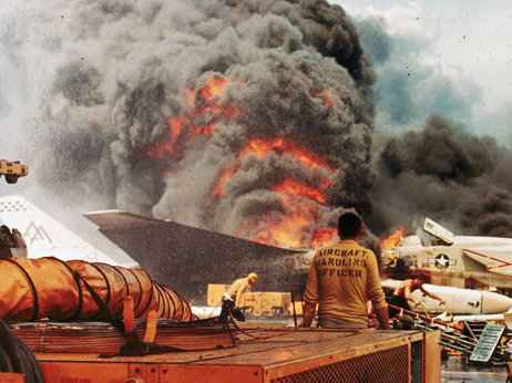 Το συγκεκριμένο αεροπλανοφόρο ίσως είναι πιο γνωστό κυρίως για την τραγική του ιστορία, για ένα δυστύχημα που προκάλεσε το 1967, στον πόλεμο του Βιετνάμ. Συγκεκριμένα, έπειτα από ένα βραχυκύκλωμα που προκλήθηκε στο πλοίο, σημειώθηκαν μια σειρά από εκρήξεις οι οποίες έπληξαν ένα αεροπλάνο F – 4 Phantom που βρισκόταν στο κατάστρωμα με πιλότο τον νεαρό John McCain ΙΙΙ, τον μετέπειτα γερουσιαστή και υποψήφιο Πρόεδρο των ΗΠΑ. Από την αλυσιδωτή αντίδραση από πυρκαγιές και εκρήξεις που έγιναν σημειώθηκαν 134 θάνατοι και τραυματίστηκαν πάνω από 300 άτομα (161 βαρύτερα), ενώ καταστράφηκαν 21 αεροσκάφη.Από τις εκρήξεις οι περισσότεροι από τους ναυτικούς που έχουν εκπαιδευτεί ως πυροσβέστες έχασαν τη ζωή τους κατά την αρχική έκρηξη , αναγκάζοντας το υπόλοιπο πλήρωμα να αυτοσχεδιάζει τις προσπάθειες διάσωσης του πληρώματος και του σκάφους .Μετά από επτά μήνες επισκευές , το πλοίο επέστρεψε αργότερα στη θάλασσα για πάνω από δύο δεκαετίες πριν από τελικά να παροπλιστεί το 1993. Στο πλαίσιο των αποστολών τoυ είχε κάνει δεκάδες αποστολές στην Μεσόγειο.