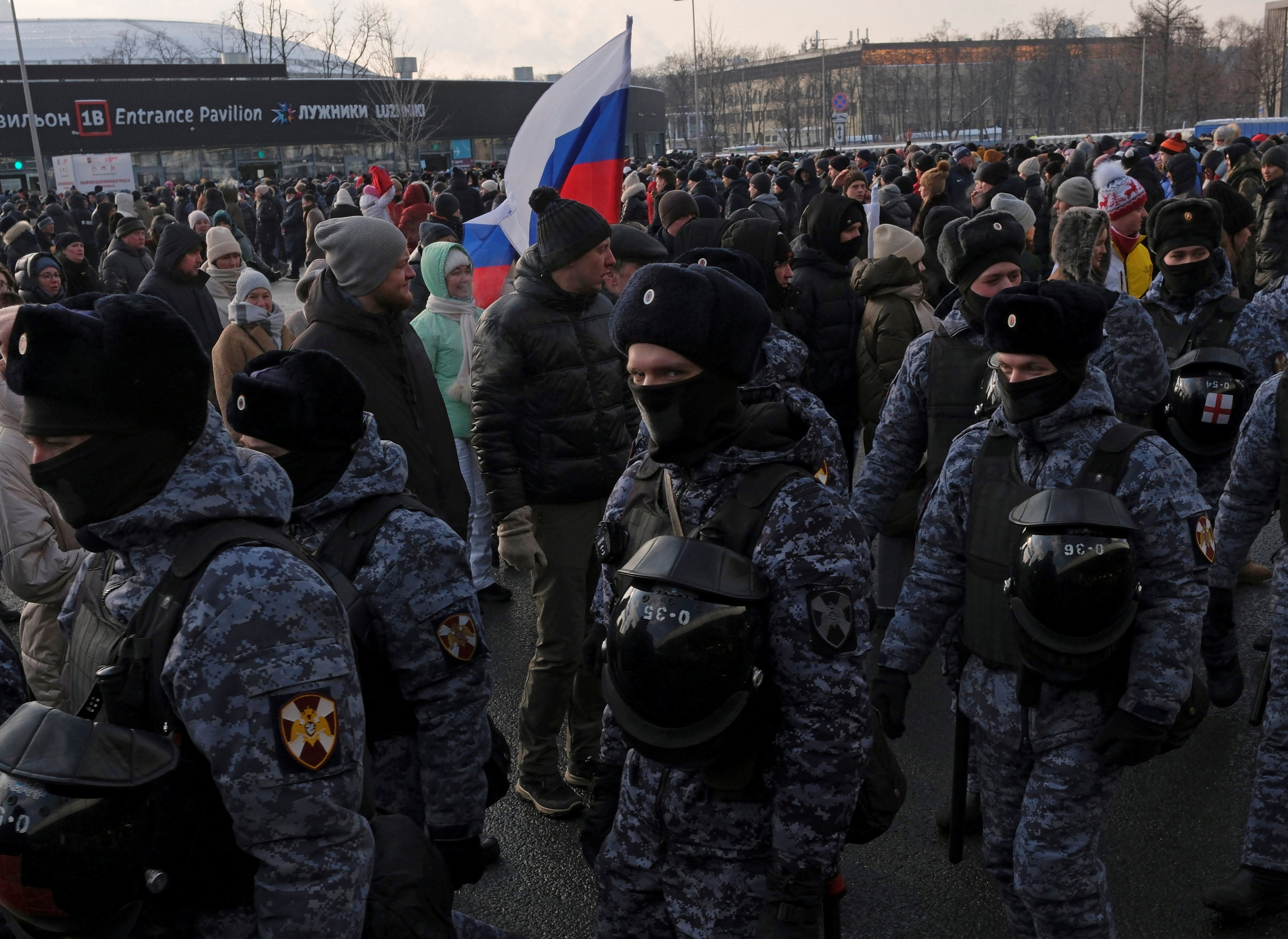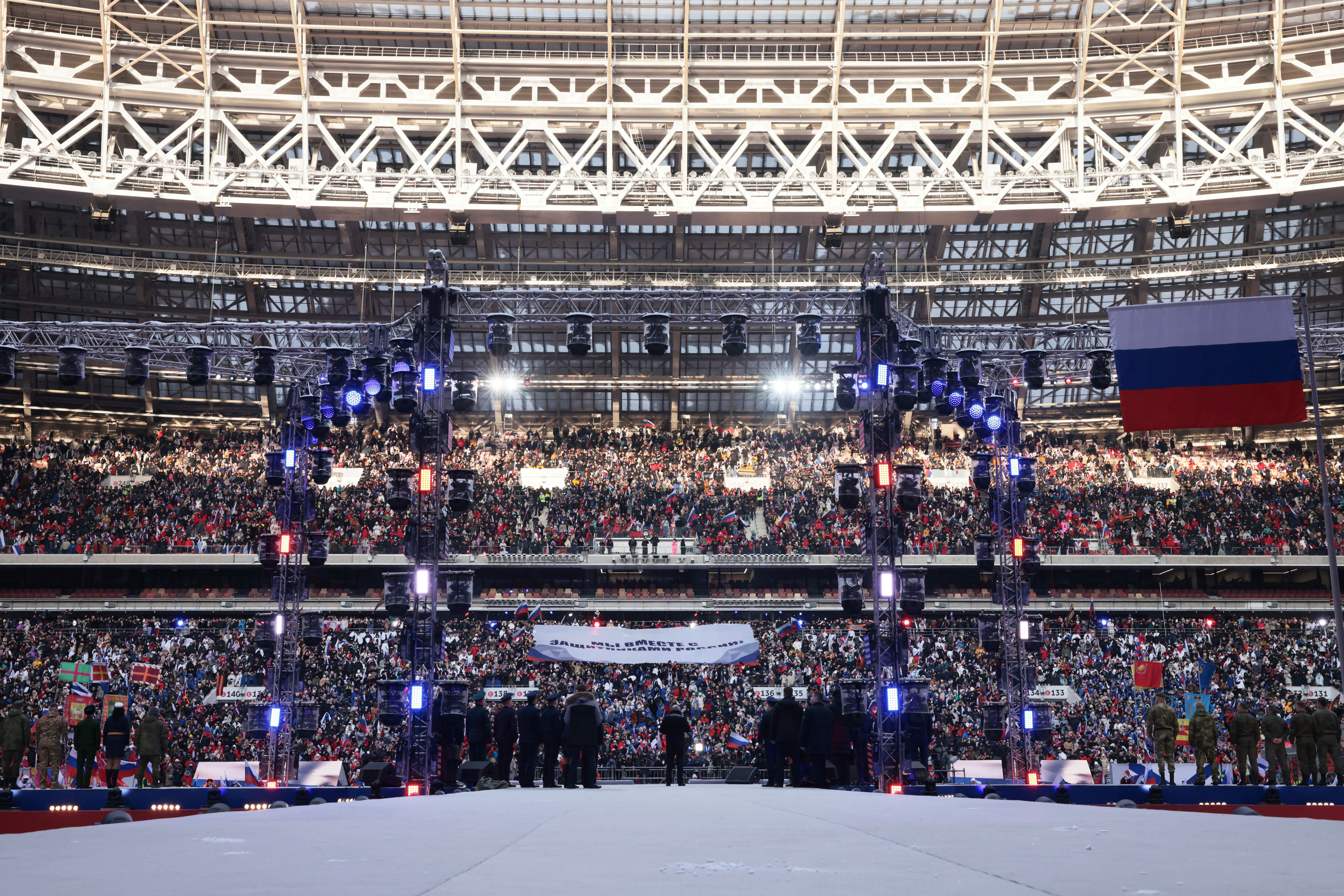 Δεκάδες χιλιάδες κόσμου συγκεντρώθηκαν στο Στάδιο Λουζνικί της Μόσχας που είναι χωρητικότητας 81.000 θέσεων, με θερμοκρασία στους μείον 15 βαθμούς Κελσίου, ανεμίζοντας ρώσικες σημαίες και ακούγοντας πατριωτικά τραγούδια πριν ο Ρώσος πρόεδρος αφιχθεί στο στάδιο.