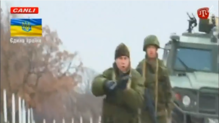 Όμως ήταν άοπλοι, αντίθετα με τους Ρώσους (που δε φέρουν διακριτικά) που είναι οπλισμένοι. Οι Ουκρανοί κρατούσαν στα χέρια τους μια ουκρανική σημαία κι άλλη μια, κόκκινη με ένα αστέρι.