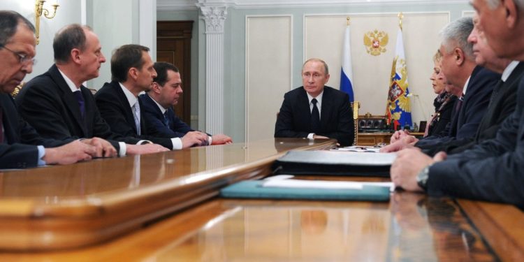 Στην συνεδρίαση του Ρωσικού Συμβούλιου Ασφαλείας συμμετείχαν ο πρωθυπουργός Ντμίτρι Μενβέντεφ, ο πρόεδρος της Ρωσικής Δούμας Βιτσισλάβ Βαλόντιν, ο προσωπάρχης του Κρεμλίνου Αντόν Βάινο, ο γραμματέας του Συμβουλίου Ασφαλείας Νικολάι Πατρούσεφ, ο υπουργός Αμύνης Σεργκεί Σόιγκου, ο υπουργός Εσωτερικών Βλαντίμιρ Καλακόλτσεφ, ο αρχηγός της FSB, o αρχηγός των υπηρεσιών κατασκοπείας Σεργκέι Ναρίσκιν και ο ειδικός σύμβουλος του Ρώσου προέδρου σε ζητήματα περιβάλλοντος, οικολογίας και μεταφορών Σεργκέι Ιβανόφ.