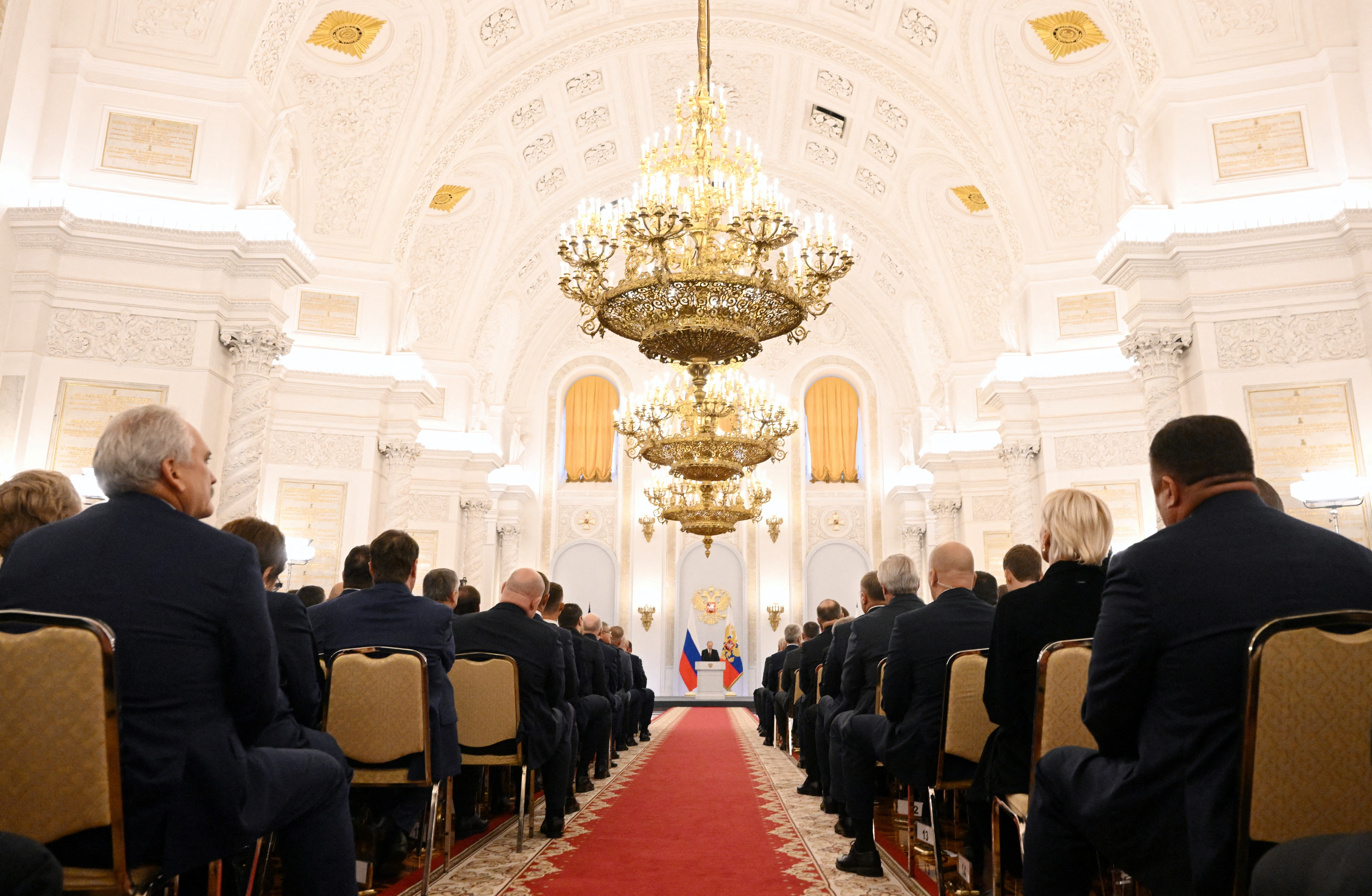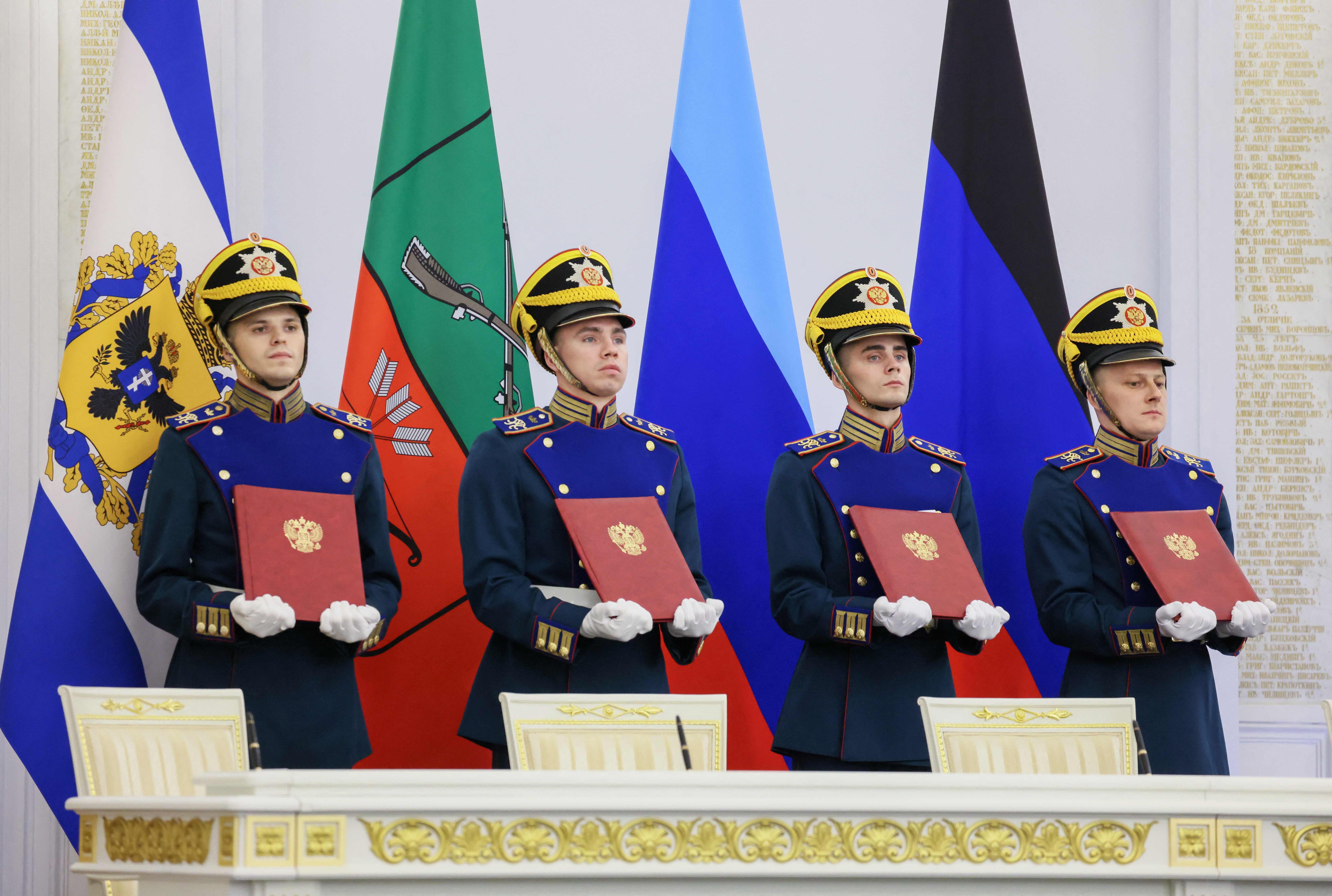 Σε μια τελετή που το Κίεβο χαρακτήρισε «ένα τερατώδες σόου του Κρεμλίνου» χωρίς καμία νομική αξία, ο Πούτιν εξαπέλυσε επί 37 λεπτά έναν λίβελο εναντίον της Δύσης, χαρακτηρίζοντάς την «σκέτο σατανά», προτού υπογράψει τα έγγραφα της συνθήκης με τους εγκατεστημένους από τη Ρωσία επικεφαλής των τεσσάρων ουκρανικών περιοχών.