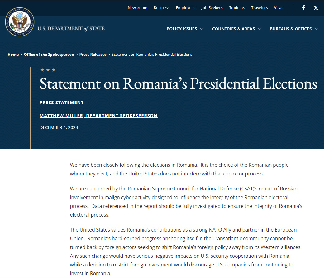 «Η σκληρά κερδισμένη πρόοδος της Ρουμανίας για να ενταχθεί στη διατλαντική κοινότητα δεν μπορεί να αντιστραφεί από ξένους παράγοντες που επιδιώκουν να στρέψουν την εξωτερική πολιτική της Ρουμανίας μακριά από τις δυτικές συμμαχίες της», ανέφερε το αμερικανικό υπουργείο σε δήλωση που εξέδωσε.