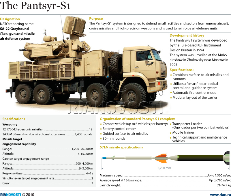 Τα αντιαεροπορικά συστήματα Pantsir S1 (ή SA-22 βάσει του κωδικού του ΝΑΤΟ) μπορούν να πλήξουν κάθε τύπου αεροπορικό στόχο σε απόφαση 20 χιλιομέτρων και σε ύψος 15. Μπορούν να πλήξουν τέσσερις στόχους ταυτόχρονα και οι πύραυλοί του μπορούν να φτάσουν ταχύτητα 1.300 μέτρων το δευτερόλεπτο.