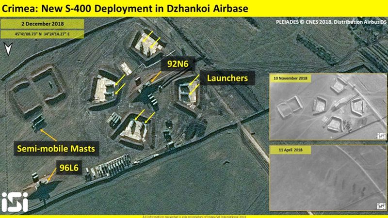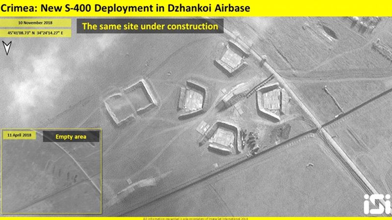 Οι φωτογραφίες δημοσιεύτηκαν από την ImageSat International και αποκαλύπτουν πως μέσα σε λίγες ημέρες η Ρωσία μετέτρεψε κενές εκτάσεις γης στην ρωσική αεροπορική βάση Dzhankoy της Κριμαίας σε θέσεις και εγκαταστάσεις από τις οποίες θα επιχειρούν οι συστοιχίες S-400, οι οποίες έχουν ήδη εγκατασταθεί στην περιοχή.