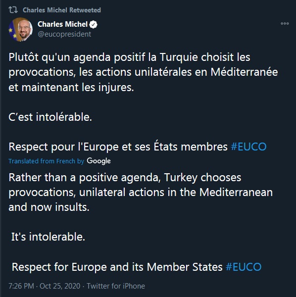 Παράλληλα, ο Σάρλ Μισέλ χαρακτήρισε «απαράδεκτα» τα σχόλια του Ταγίπ Ερντογάν εναντίον του Εμανουέλ Μακρόν και γι’ αυτό το λόγο -είπε- απάντησε αμέσως, αναφερόμενος σε ανάρτησή του στο twitter τις προηγούμενες ημέρες, όπου έγραφε: «Αντί για θετική ατζέντα, η Τουρκία επιλέγει προκλήσεις, μονομερείς ενέργειες στη Μεσόγειο και τώρα τις προσβολές. Είναι απαράδεκτο. Σεβασμός στην Ευρώπη και στα κράτη μέλη της».