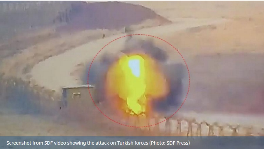 Ένα βίντεο που κυκλοφόρησε από τις SDF φαίνεται να δείχνει έναν κατευθυνόμενο πύραυλο από τη Συρία που στοχεύει ένα τουρκικό στρατιωτικό όχημα μέσα στην Τουρκία, δίπλα στα σύνορα Συρίας – Τουρκίας.