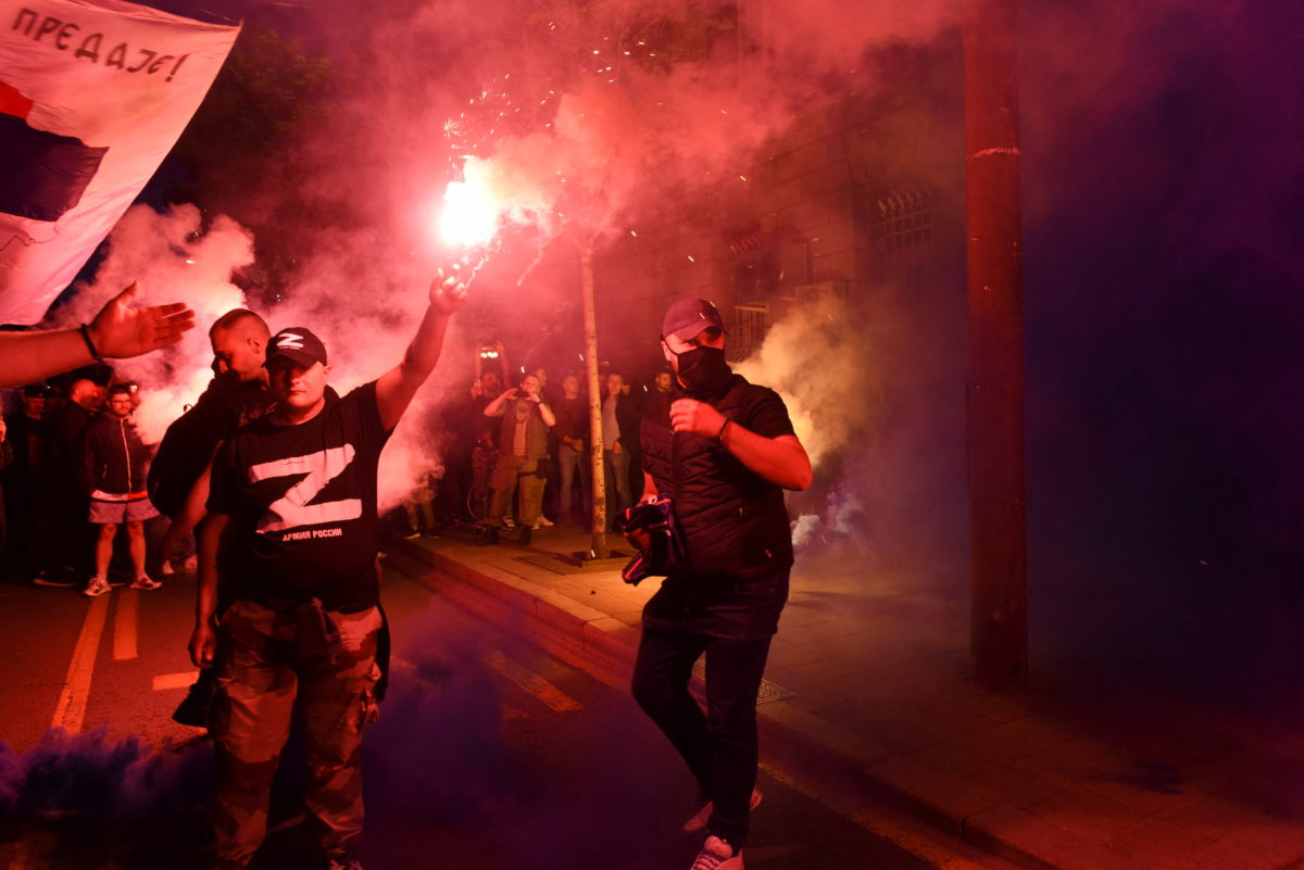 Πλήθος διαδηλωτών, ανάμεσά τους πολλοί από υπερεθνικιστικές οργανώσεις, συμμετείχε στην πορεία από το κέντρο της πόλης προς τη ρωσική πρεσβεία, όπου εκτόξευσαν φωτοβολίδες και έπαιξαν τους εθνικούς ύμνους της Ρωσίας και της Σερβίας, χαιρετίζοντας τις δύο χώρες ως αδελφικά Έθνη.