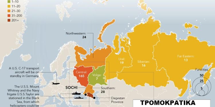 Σύμφωνα με την Huffington Post oι ΗΠΑ έχουν τοποθετήσει δυο πολεμικά πλοία στην Μαύρη Θάλασσα κι ενα C – 17 μεταφορικό αεροσκάφος βρίσκεται σε ετοιμότητα στη Γερμανία (Όπως δείχνει ο χάρτης – Στον χάρτη φαίνονται επίσης οι περιοχές με τα περισσότερα τρομοκρατικά χτυπήματα, το Σότσι και η περιοχή του Καυκάσου – σύμφωνα με τις πληροφορίες της Huffington Post – εχει τα περισσότερα τρομοκρατικά χτυπήματα).