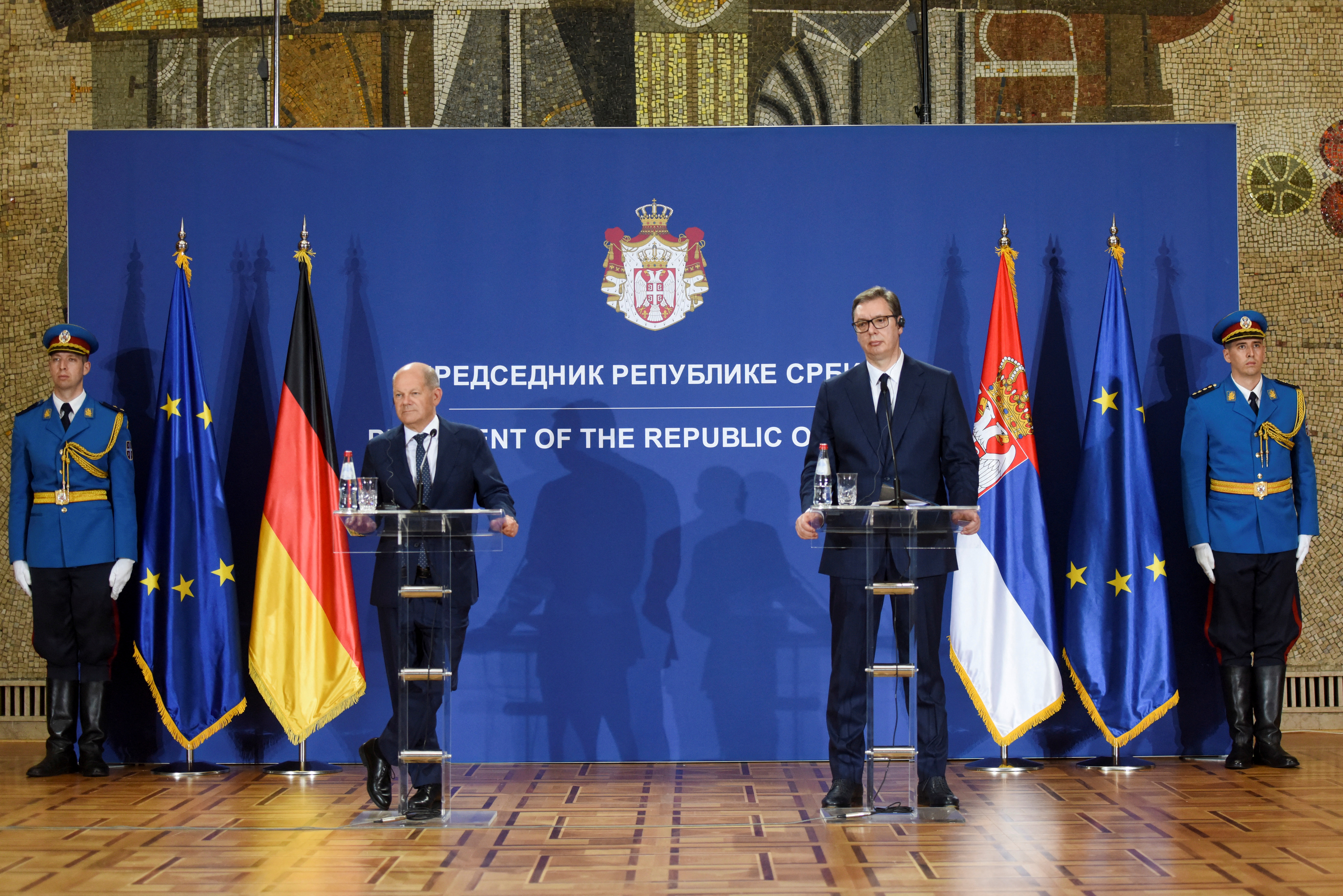 Ο Όλαφ Σολτς στην κοινή συνέντευξη Τύπου επιβεβαίωσε πως έθεσε το θέμα αυτό λέγοντας ότι «όλες οι προς ένταξη χώρες έχουν την υποχρέωση να εφαρμόζουν την κοινή εξωτερική πολιτική της Ευρωπαϊκής Ένωσης». Ο Γερμανός καγκελάριος συμπλήρωσε ότι ζήτησε από τη Σερβία να μην αναβάλει την απόφαση για την επιβολή κυρώσεων κατά της Ρωσίας και «να το πράξει άμεσα όσο το θέμα είναι επίκαιρο».